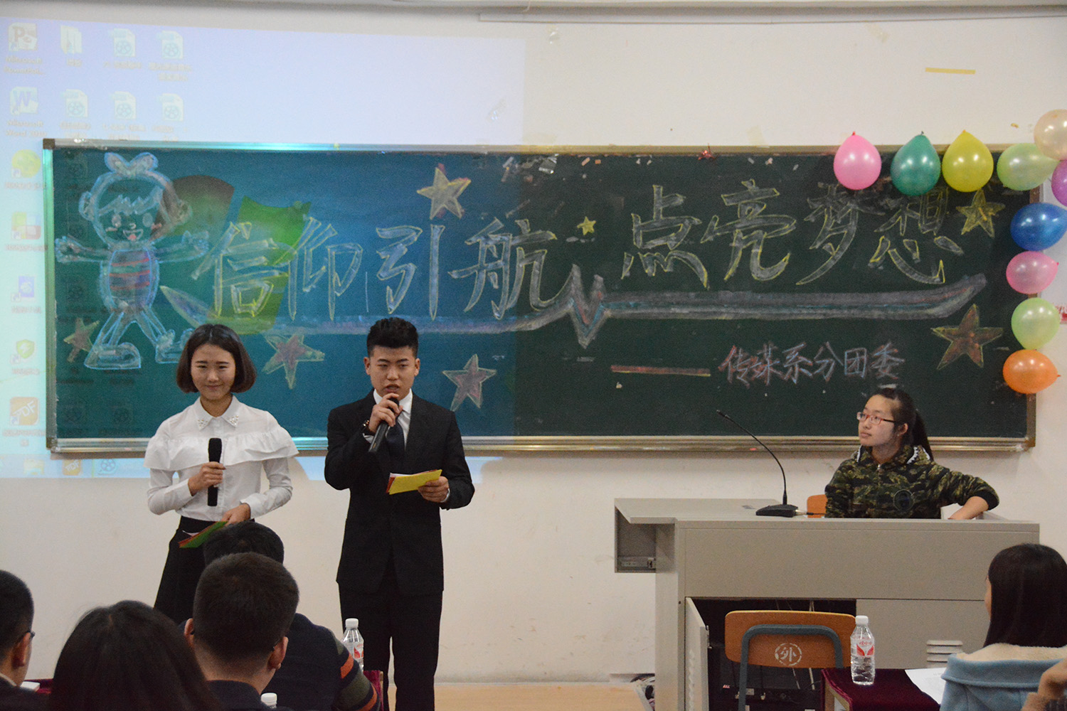 11月5号晚,由传媒系分团委主办的“信仰引航,点亮梦想”主题团会在第三教学楼3421教室举办,此次团会特邀嘉宾有院团委老师高立伟、传媒系辅导员张明亮、王胤等,15级全体学生参加活动。