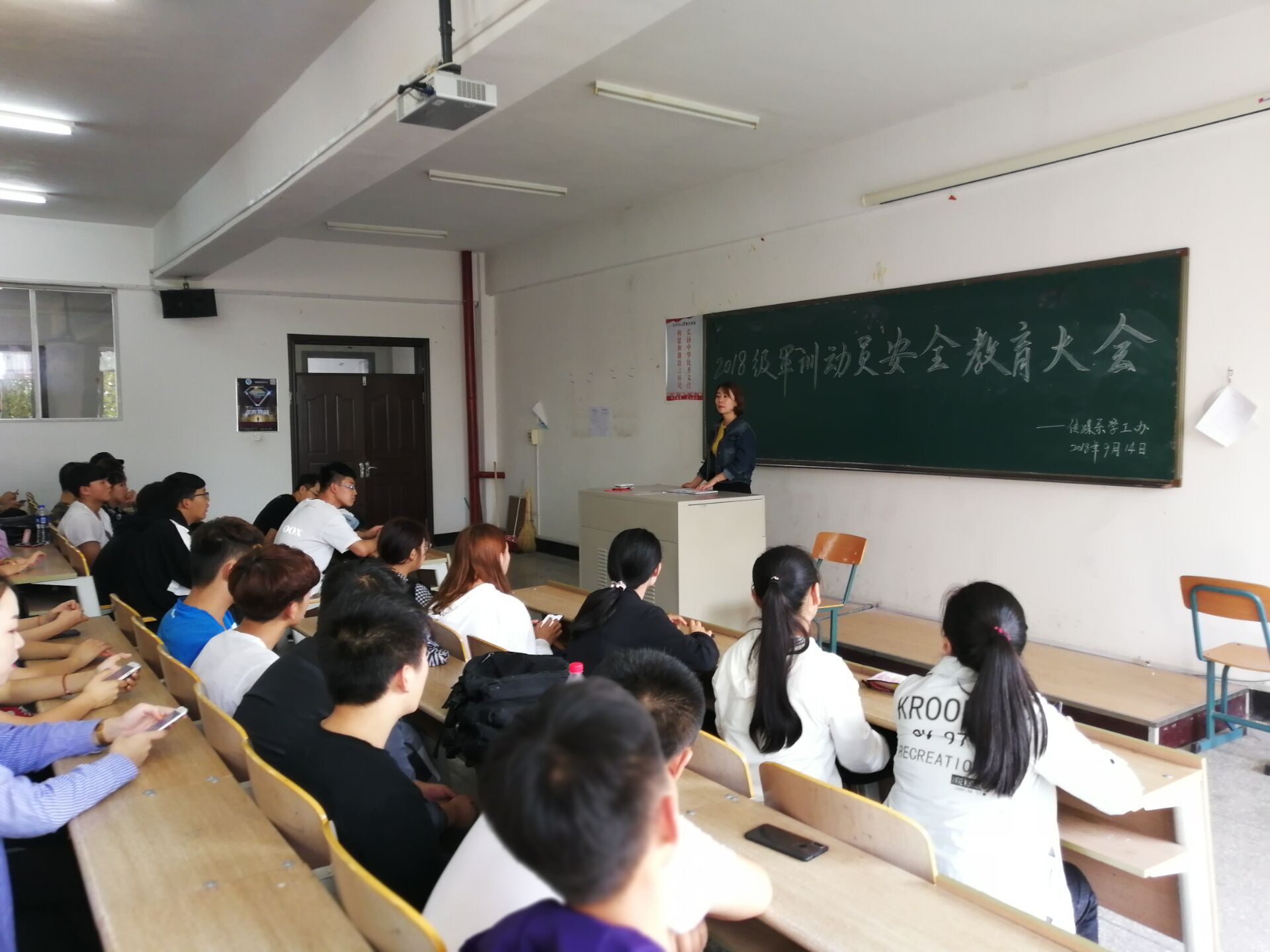 2018年9月14日,由传媒系学工办主办的18级军训动员安全教育大会于第三教学楼3420召开。我系辅导员老师王天明、辅导员助理江丹丹、张金凡,学生会主席徐吉省,分团委副书记聂洪博,社团联合会主席王东宇以及18级139名新生参加本次活动。