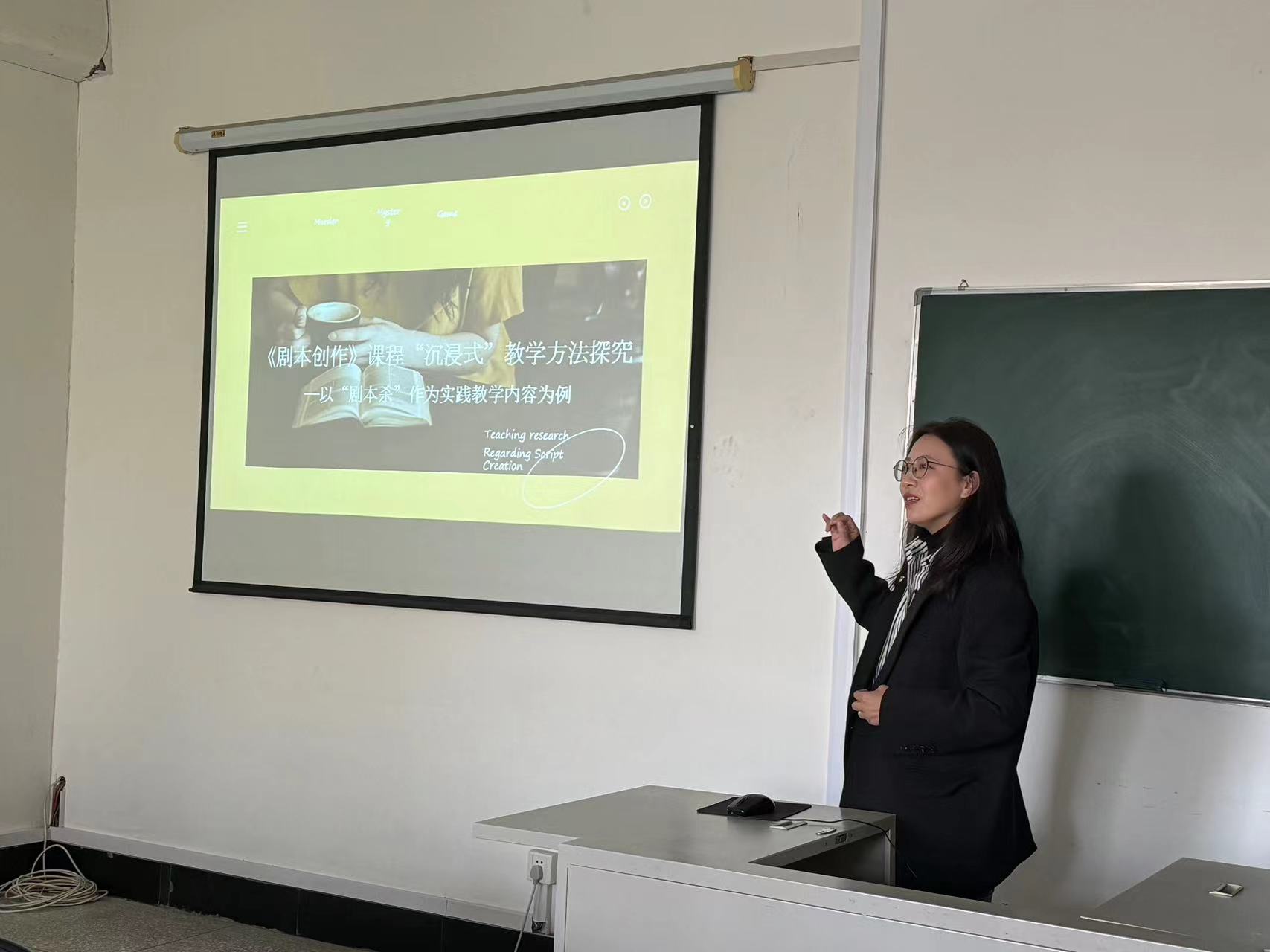 2024 年 10 月 9 日下午,传媒学院在3511-4教室成功召开了一场以“《剧本创作》课程沉浸式教学方法探究——以剧本杀作为实践教学内容为例”为主题的教研活动。此次活动旨在为剧本创作课程注入新的活力,提升教学质量,培养学生的创新思维和实践能力。