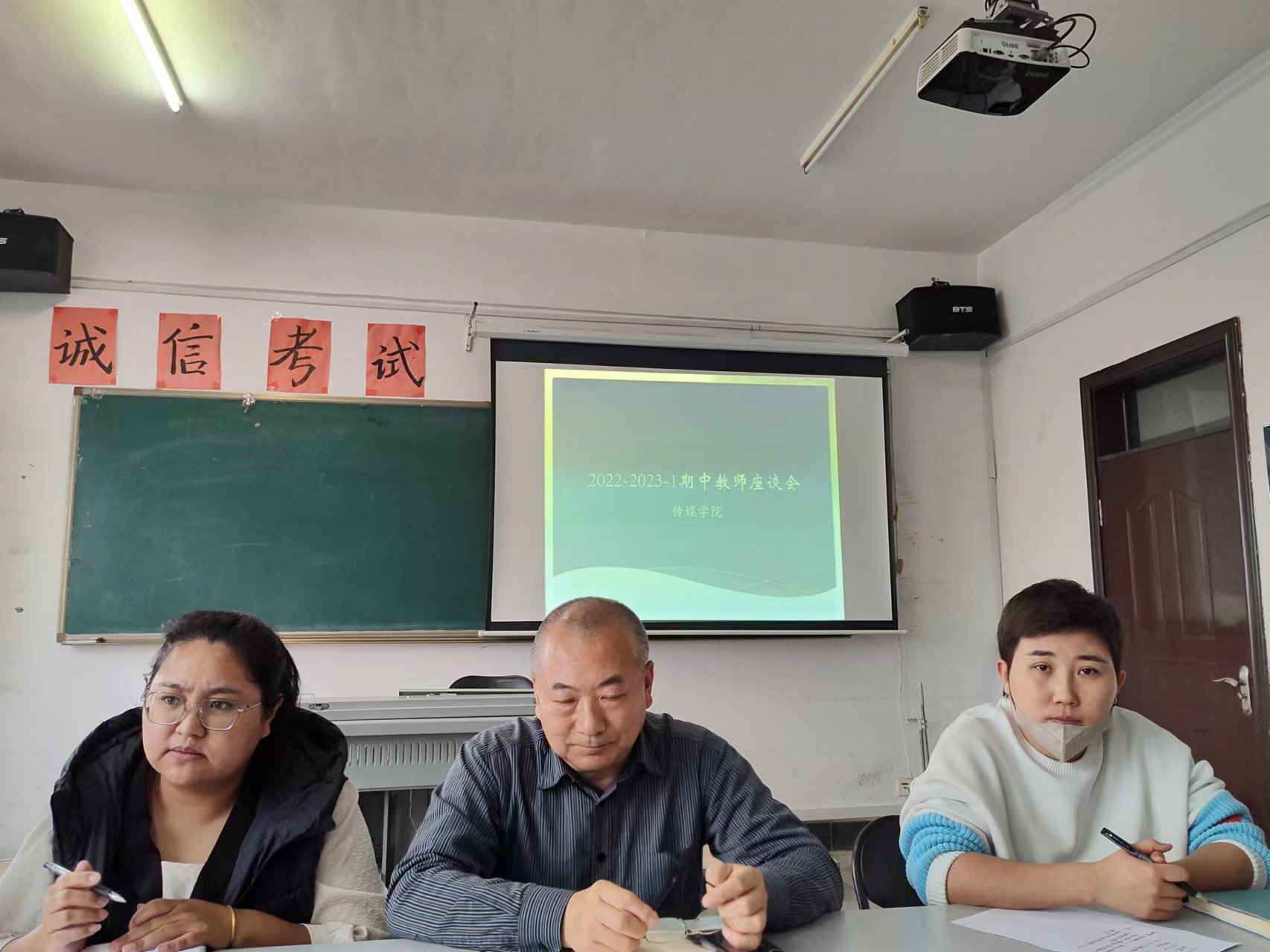 2022年11月9日下午,传媒学院在3407教室举行了2022-2023-1学期期中教师座谈会。此次会议由传媒学院副院长马兢主持,参加此次会议的有传媒学院院长姜洪德、招生办公室主任王丽红、王俐瞳以及传媒学院全体教师。