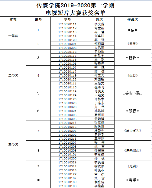 本次比赛以传媒学院2017级广播电视编导和数字媒体技术专业的专业必修课《电视摄像技术》《非线性编辑》为依托,共选出一等奖2名,二等奖3名,三等奖5名,