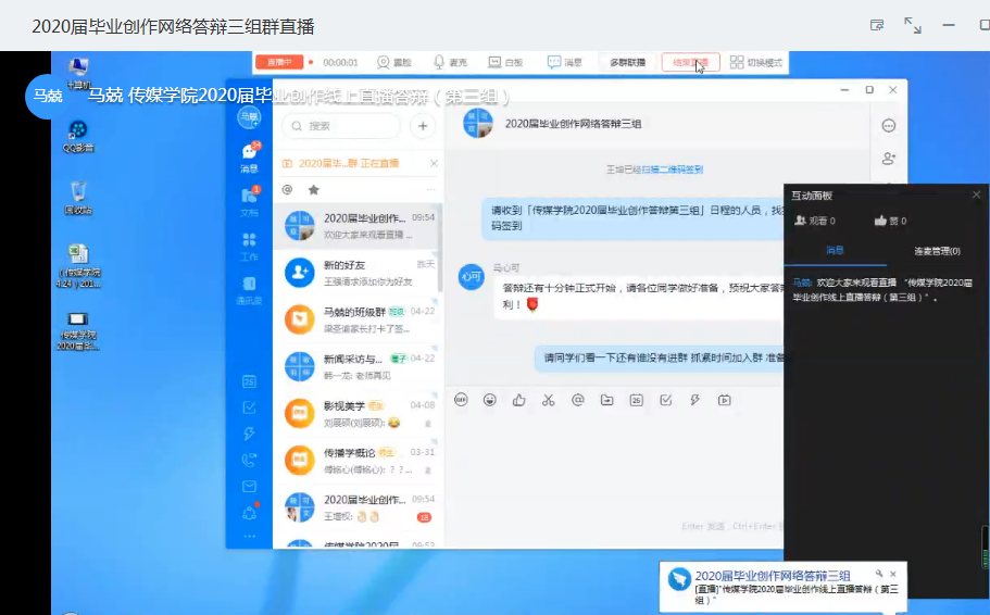 毕业创作答辩是检验传媒学子四年学习成果的“大考”。4月25日上午,传媒学院2020届毕业创作答辩工作在3409、3507教室及线上进行。本届毕业创作答辩工作领导小组由王援院长担任组长。受新冠疫情影响,此次答辩工作选择钉钉平台网络直播答辩的形式,分为三组,学生人数共计78人,2016级全体学生参加毕业创作答辩工作。
