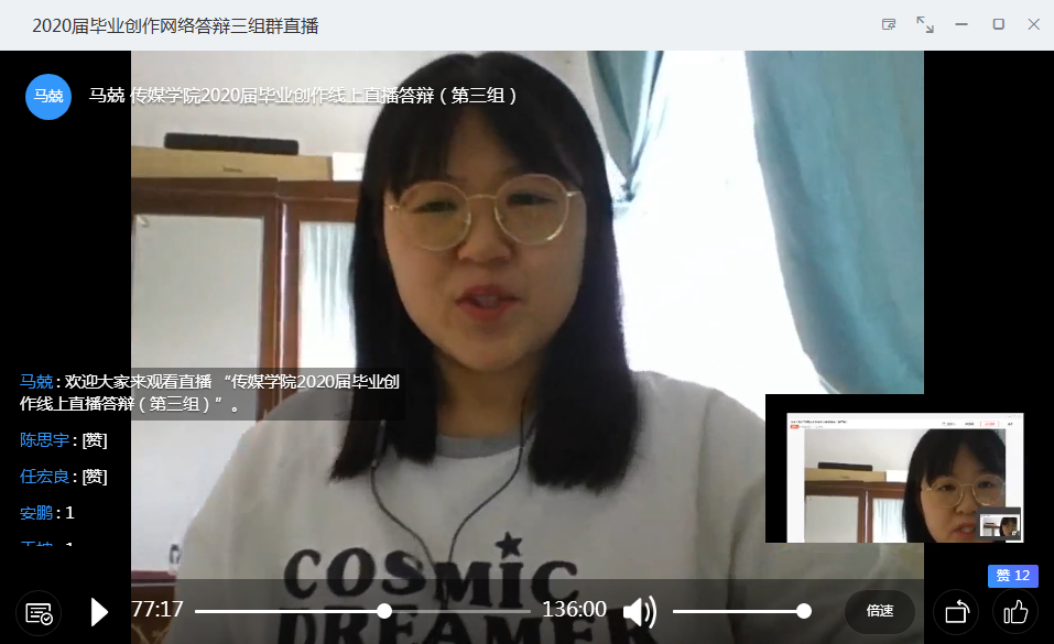 毕业创作答辩过程中,学生井然有序地进行毕业创作答辩,现场氛围严肃,流程规范。此次答辩通过毕业作品结合文字讲解的形式,参与答辩的学生们,依次通过与答辩组老师连麦,由导演阐述自己作品的实际意义。答辩组师生共同观看毕业创作作品。随后,老师对作品内容提出相关问题。答辩组老师们秉承着严谨负责的态度从作品选题、框架、拍摄角度、镜头衔接、文本创作等方面进行了全面的评审,并提出修改意见,让同学们认识到作品的补足,并进一步完善作品。