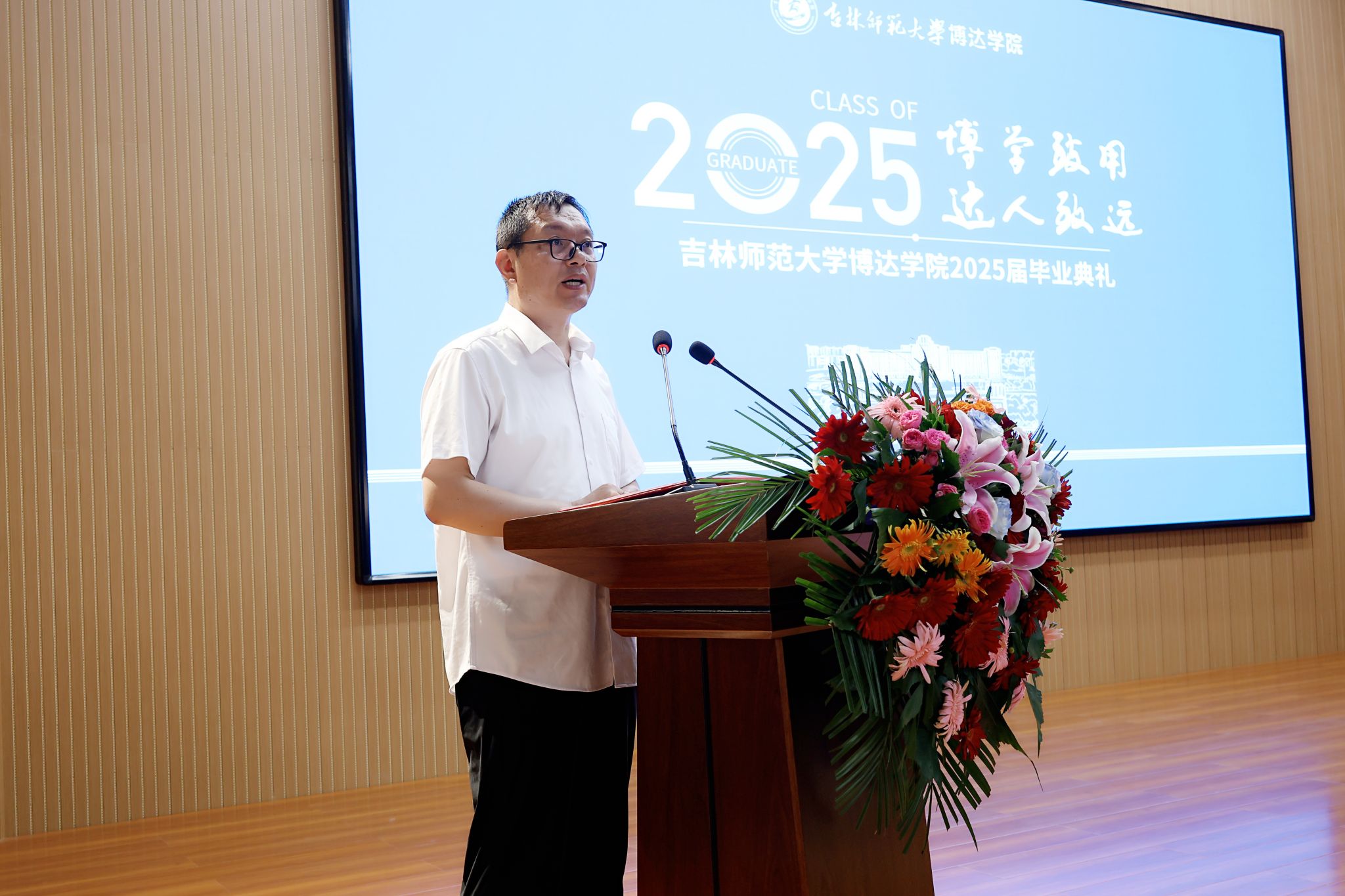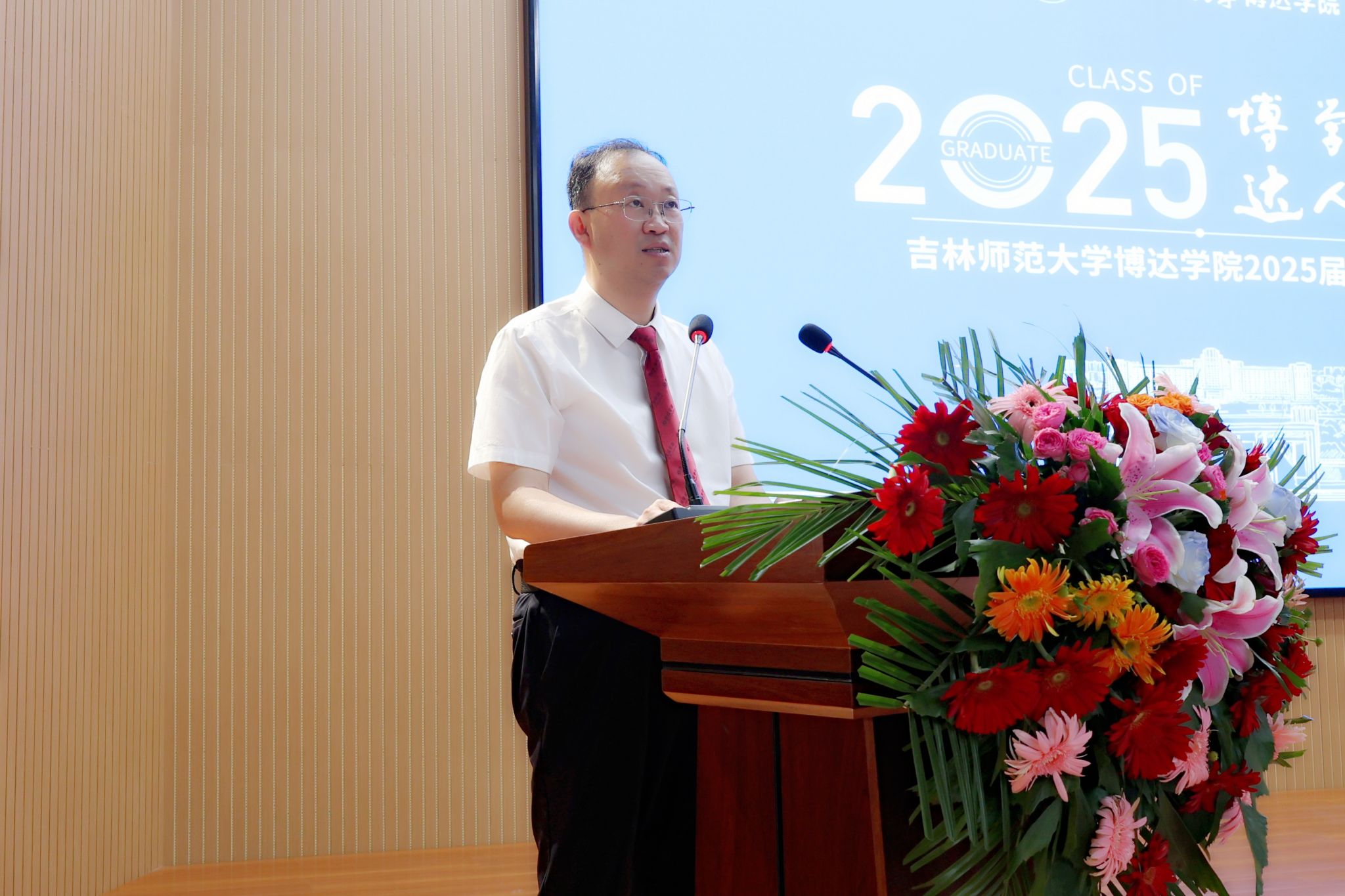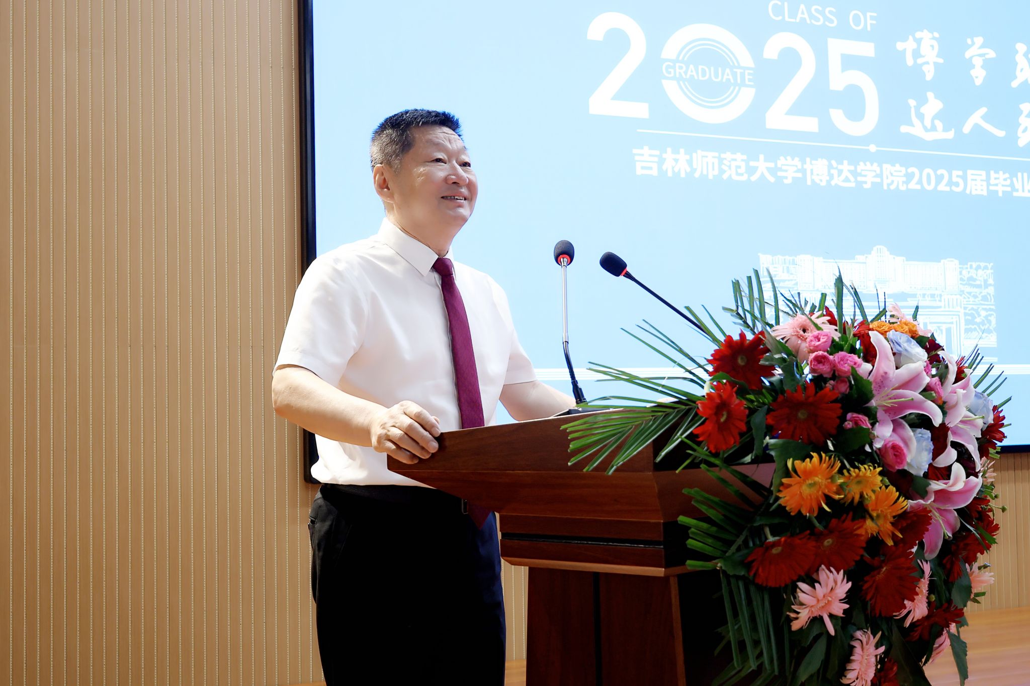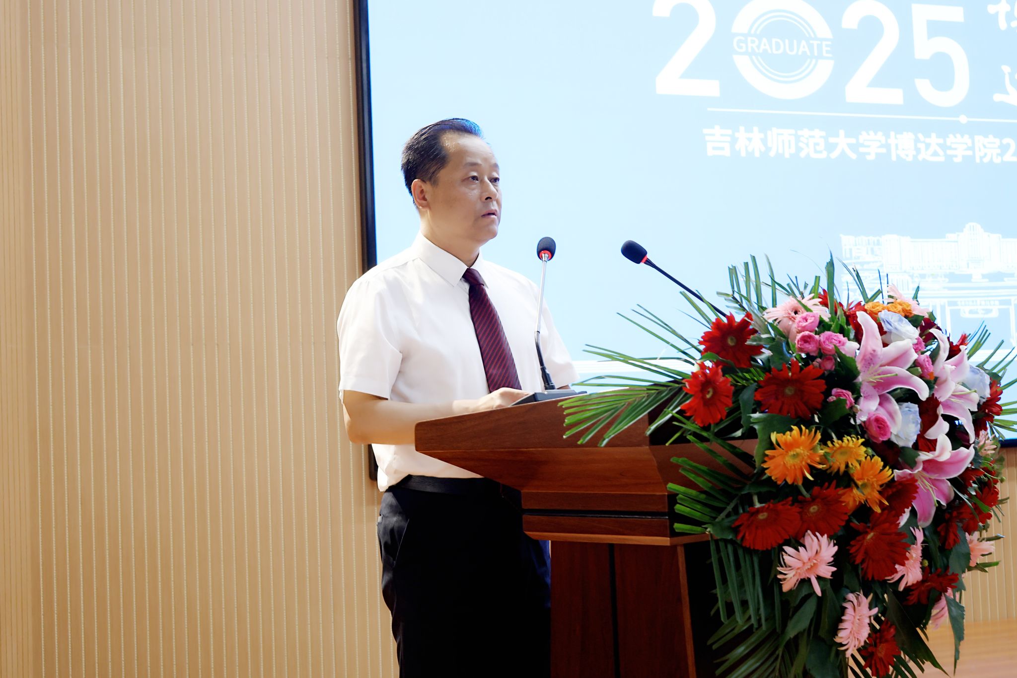 他首先代表学校党政班子和全体师生向全体毕业生顺利完成学业表示热烈地祝贺!同时为同学们即将开始的新生活送上叮嘱:希望同学们面对人生拥有信心、韧性、成长,可以勇往直前,做坚定的行者,从容地应对这个多变的世界。用信心坚守前行的方向。希望同学们相信美好未来并愿意为之努力,用信心坚守前行的方向,相信青春是因为奋斗而璀璨夺目,前路因为开拓才充满繁华。以韧性化作前行的铠甲。希望同学们学会驾驭挑战和挫折,让困难成为前进的助力,做有韧性的人,学习水一样的智慧,遇山则绕,迂回而不停滞,遇壑则填,沉潜而不退缩;学习竹子一般的坚韧,风来时俯身,示弱而不屈服,风过后挺立,柔韧而不折节。以成长加快前行的速度。希望同学们能够“活到老,学到老”,提升学习力,做复合型人才。确定学习方向,激发学习动力,多维度提升学习能力,同时增强坚持力,获得“长期”的价值。分解学习目标,培养学习习惯,提升学习毅力,成为真正的长期主义者。
