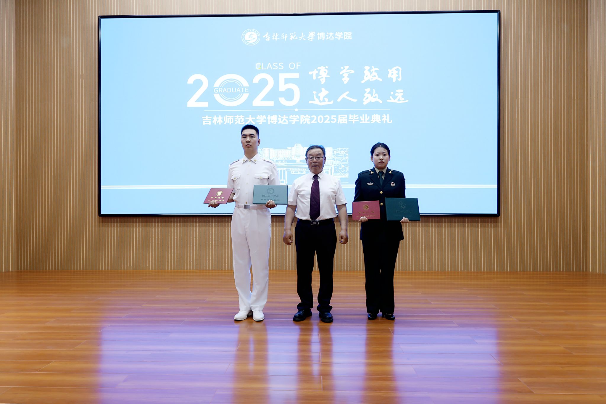 校长张勇为2025届退役大学生士兵代表吴星潼、潘昊颁发毕业证书及学士学位证书。