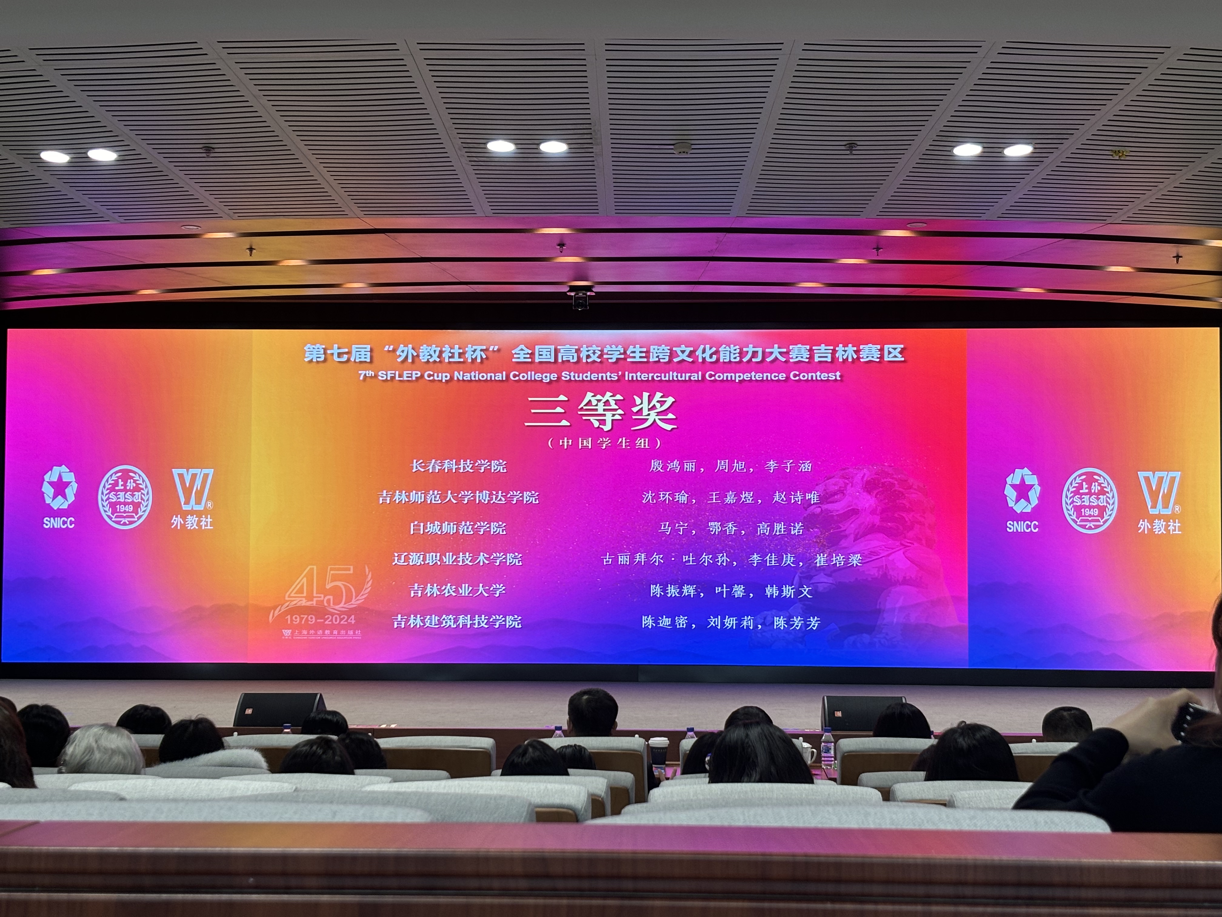 11月9日-10日, 经过两天的激烈角逐,第七届“外教社”全国高校学生跨文化能力大赛(吉林赛区)在东北师范大学圆满落幕。我校师生在大赛中斩获三等奖和优秀指导教师奖。