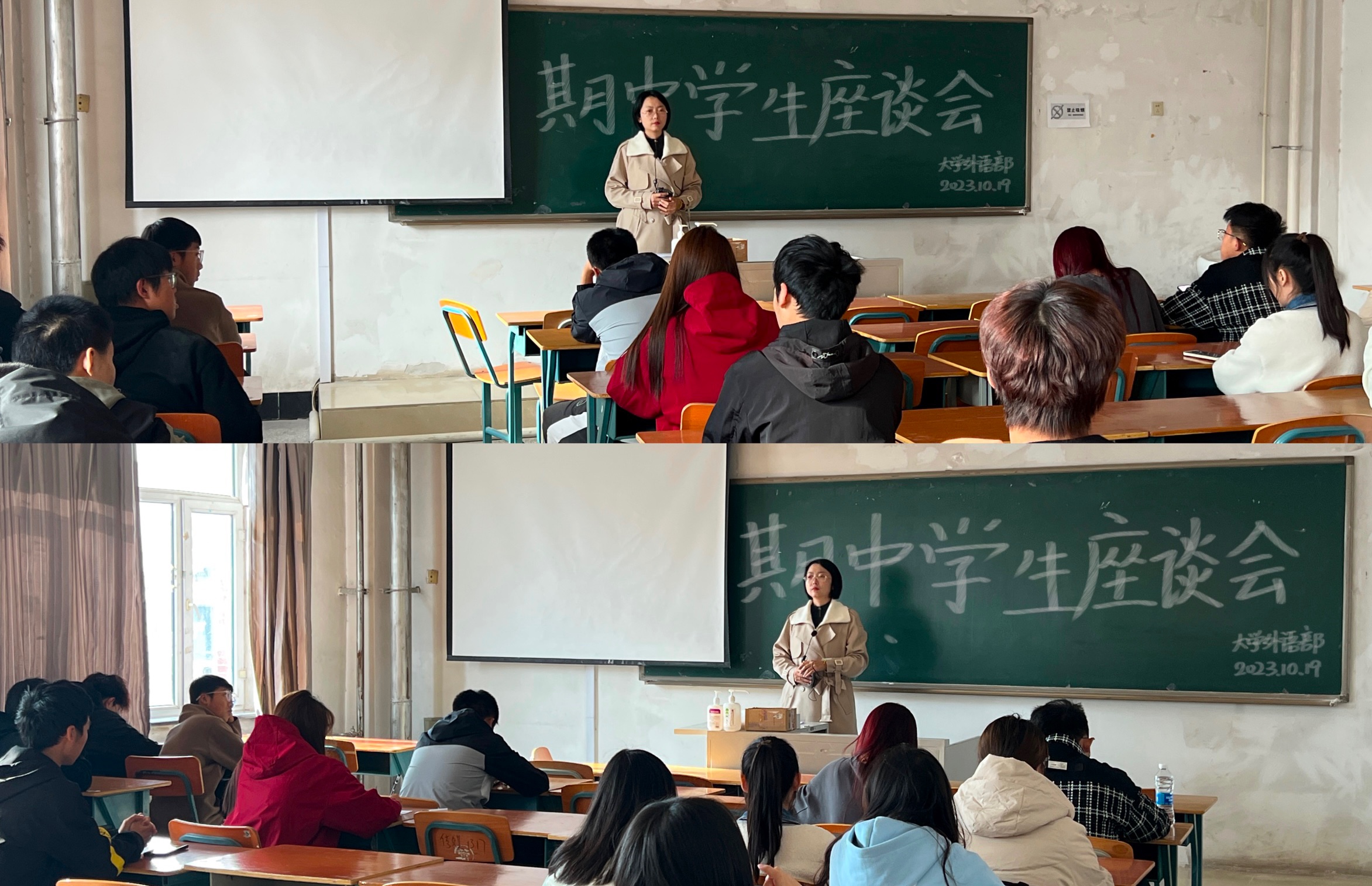 2023年10月19日下午2点,大学外语部在老校区1317教室召开了2023-2024年学度第一学期期中教学检查学生座谈会。来自学校2022级和2023级的学生代表参加了此次座谈会。座谈会由大学外语部崔惠茹副主任主持。