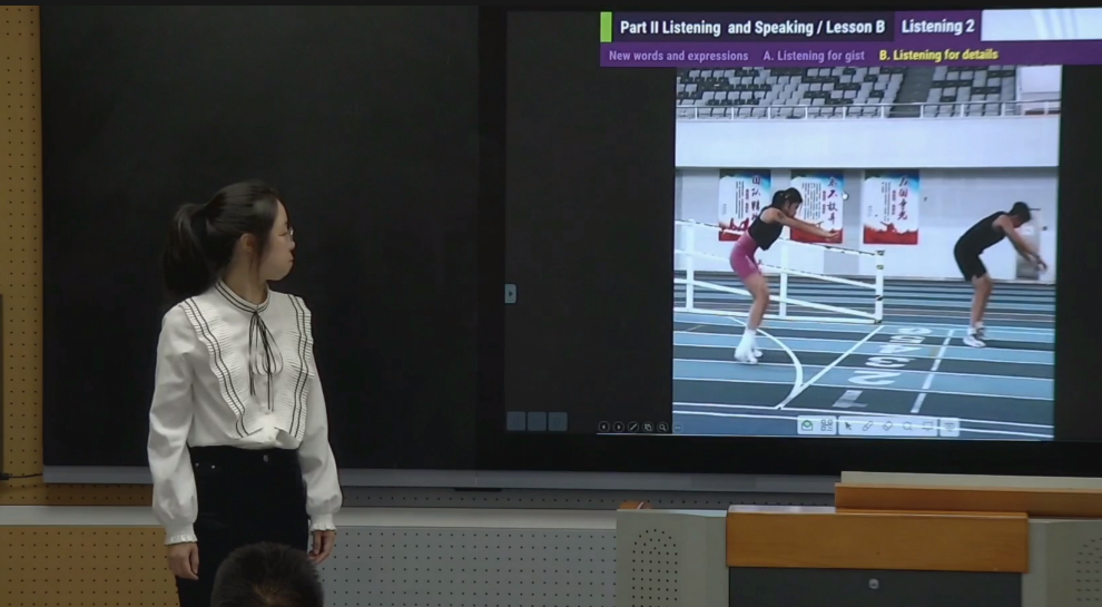 闫馨予老师的授课文本单元主题为Sports。闫老师首先介绍了整体的单元教学设计,包括授课对象(年级、英语水平)、教学目标(知识、能力、品德)、教学方法(任务式教学、产出导向)和教学过程(教学内容、及实施环节)。闫老师的教学设计整体框架清晰,教学目标明确,课前、课中和课后教学环节的设计基于产出导向教学法,体现了教学内容和教学目标的对应关系,反映出授课教师较好的教学素养。闫老师首先以体育冠军的赛场准备造型图引入授课主题,逐渐引导学生思考“运动”的意义。在接下来的环节中,闫老师完成了以下几个教学任务:知识层面——理解听力材料;能力/技能层面——听力技巧的使用,及学会如何对学习的单词进行准确表达。