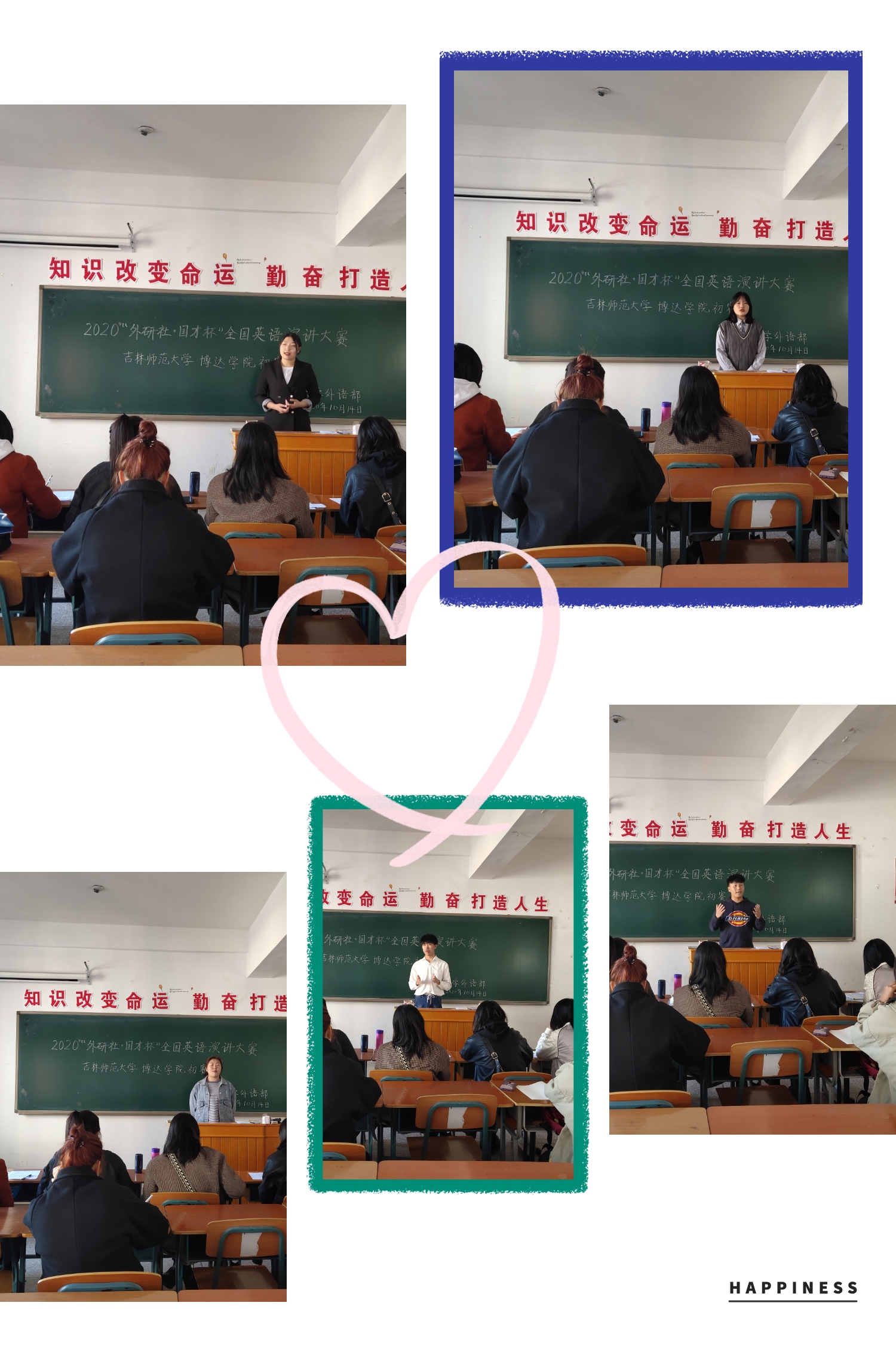 近日,大学外语部成功举办了2020“外研社·国才杯”全国英语演讲大赛、写作大赛、阅读大赛博达赛区初赛。作为大学外语部一年一度的重要赛事,大学外语部高度重视“外研社·国才杯”大赛,赛前对比赛进行了全面宣传,对比赛各个环节进行了周密的安排。