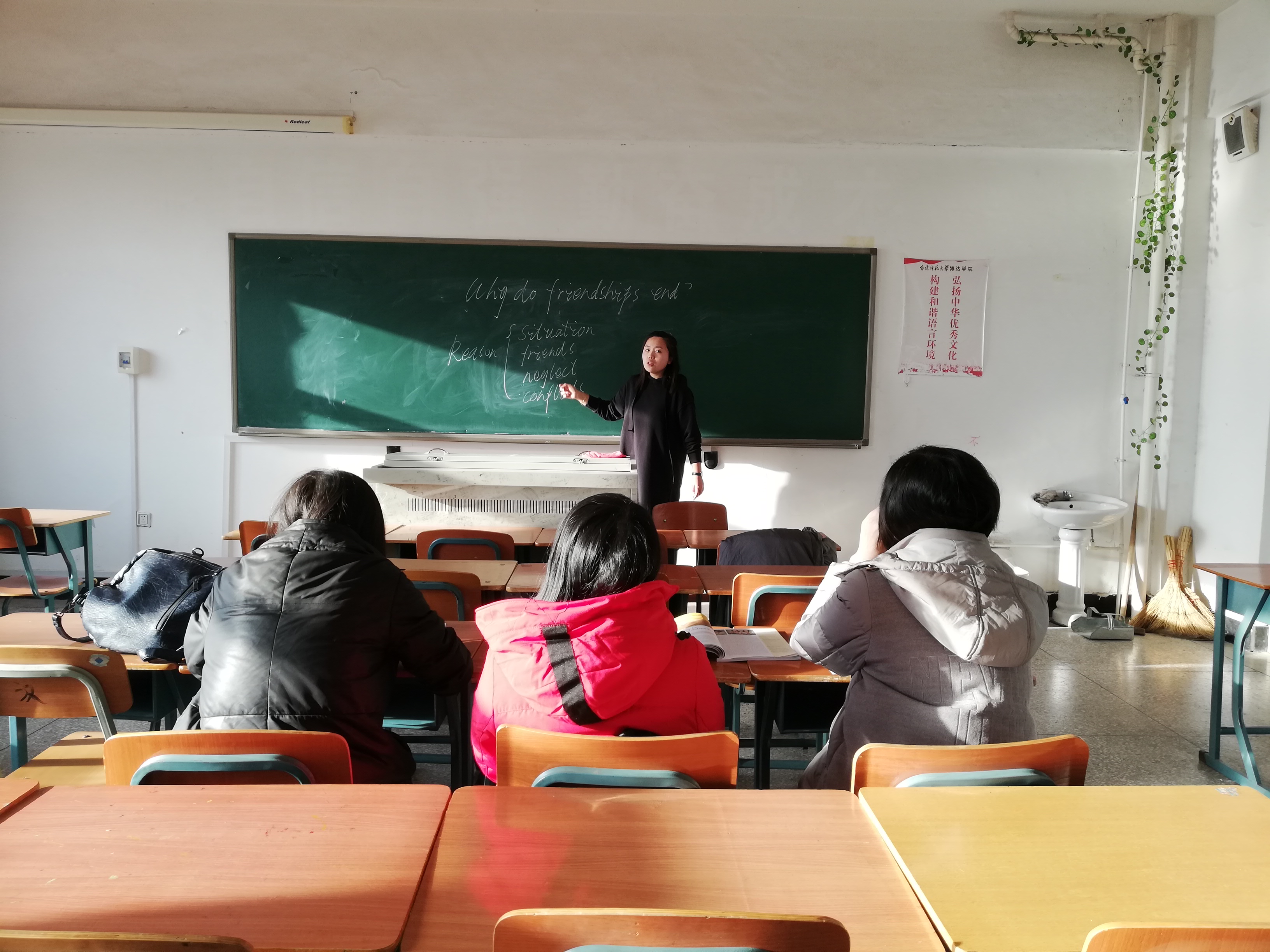 宋迎老师2018-2019学年度第二学期将首次讲授艺术类大学英语Ⅱ课程。本次试讲,宋迎老师选取了课程教材《全新版进阶大学英语综合教程2》中第三单元内容“Why do Friendships End ? ”。试讲过程中,宋迎老师脱稿采用板书全英文授课,英语口语表达流畅清晰自然,课程节奏恰到好处,符合艺术类学生的学情。课程导入新颖,教学目标和教学重难点明确,教学思路清晰,教学反思深刻。试讲结束后,副主任党冀进行了点评,对宋迎老师的教学方法和教学效果给予了肯定,并希望宋迎老师在实际授课中增加与学生互动内容。