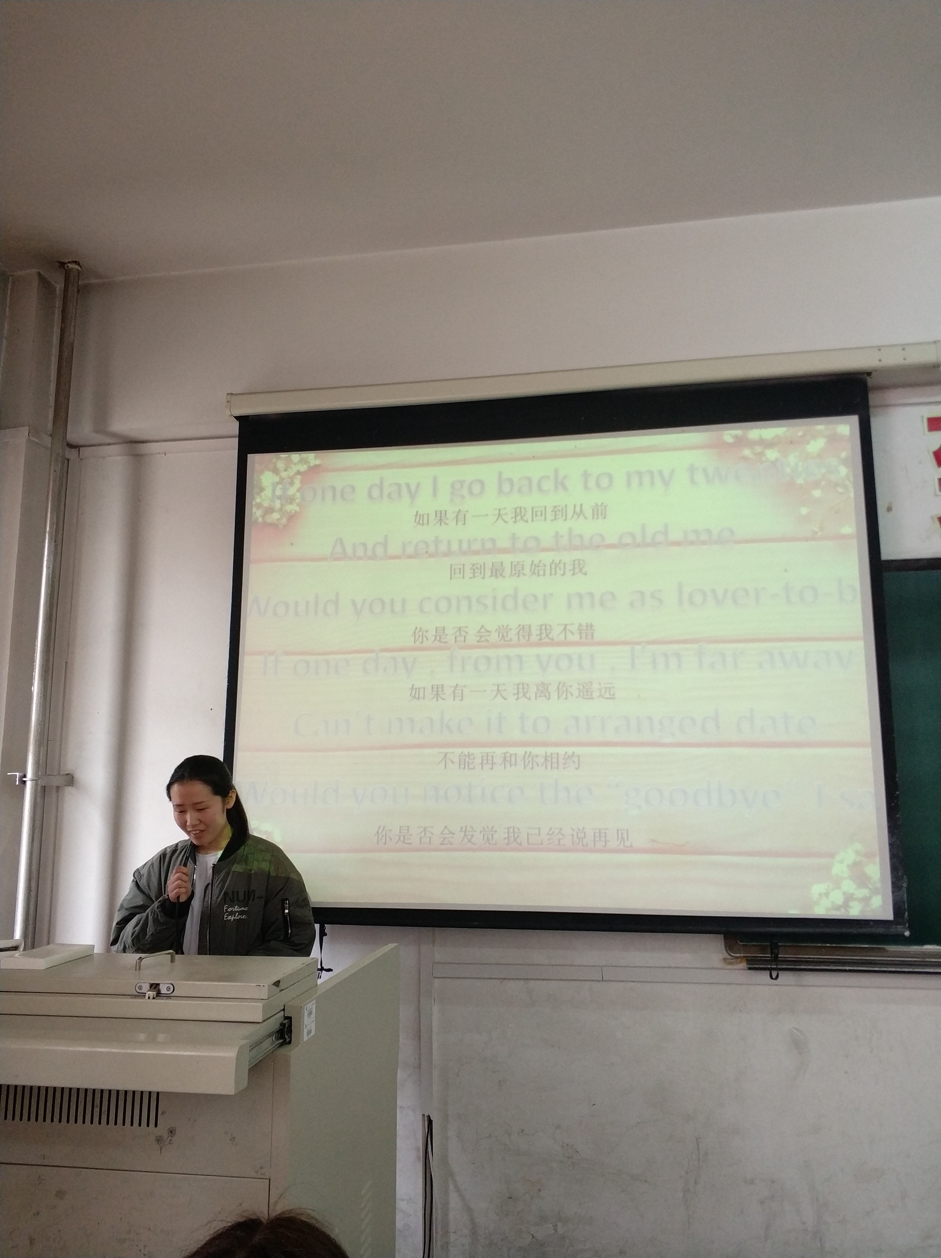 大学外语部首次英文歌曲大赛深受学生们的喜爱和好评,赛后很多同学表示意犹未尽,纷纷报名,想要一展歌喉,通过英文歌曲表现个人风采。应学生要求,2018年4月13日下午3点半精英班在二教2315教室举办了本学期第二次英文歌曲大赛。来自精英班的18名同学参加了比赛,从拷贝伴奏音乐到抽签出场顺序,赛前准备工作紧张有序地进行着。