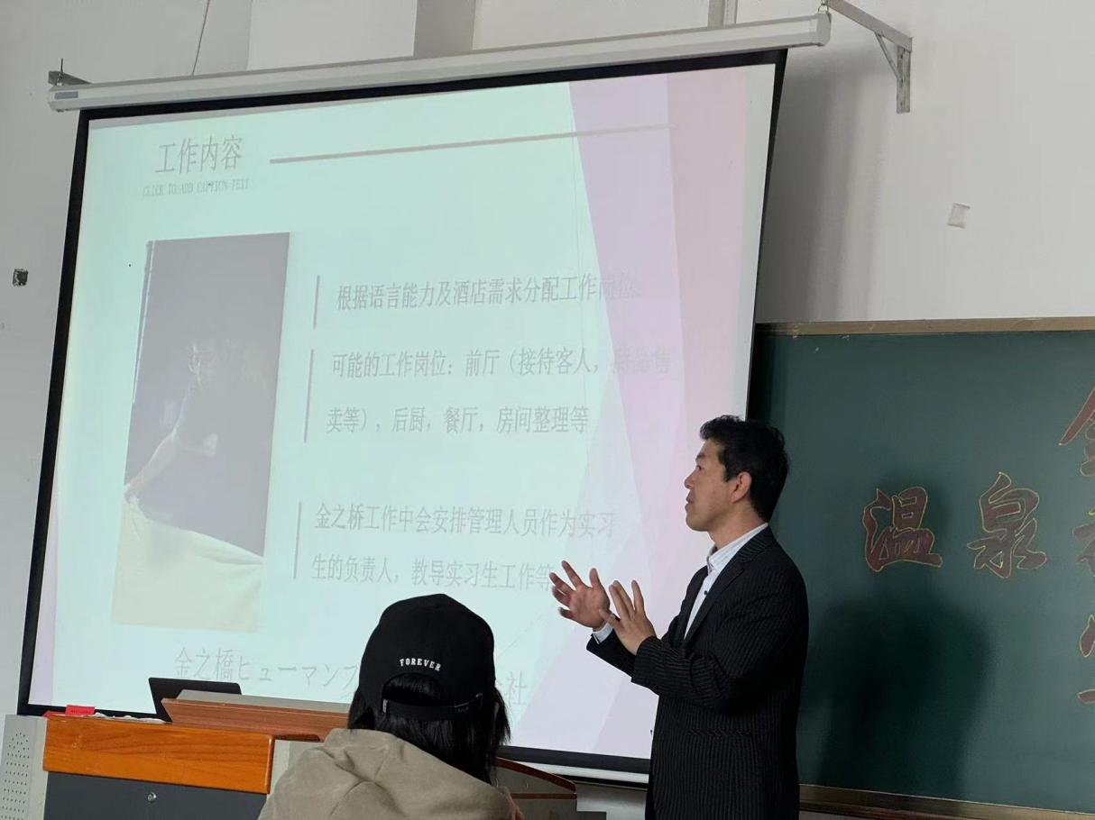 为了开拓海外实习基地,搭建学生与用人单位之间的沟通桥梁,引导学生树立正确的择业观、就业观,提高学生就业能力、就业质量。国际合作与交流处于4月22日为日语学生开展金之桥人力有限公司日本温泉旅馆实习项目招聘宣讲会。外国语学院日语专业周晓彤老师、日语专业王冰老师以及日语专业21级学生参加。