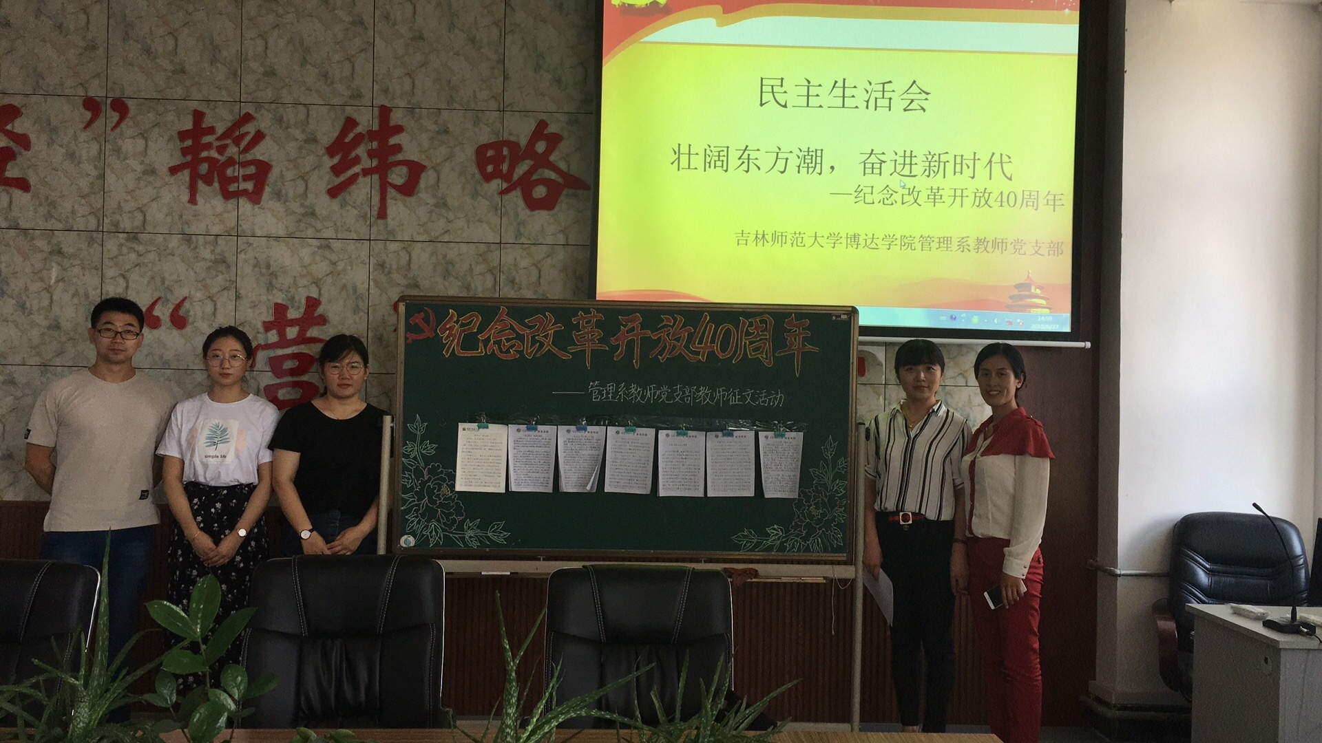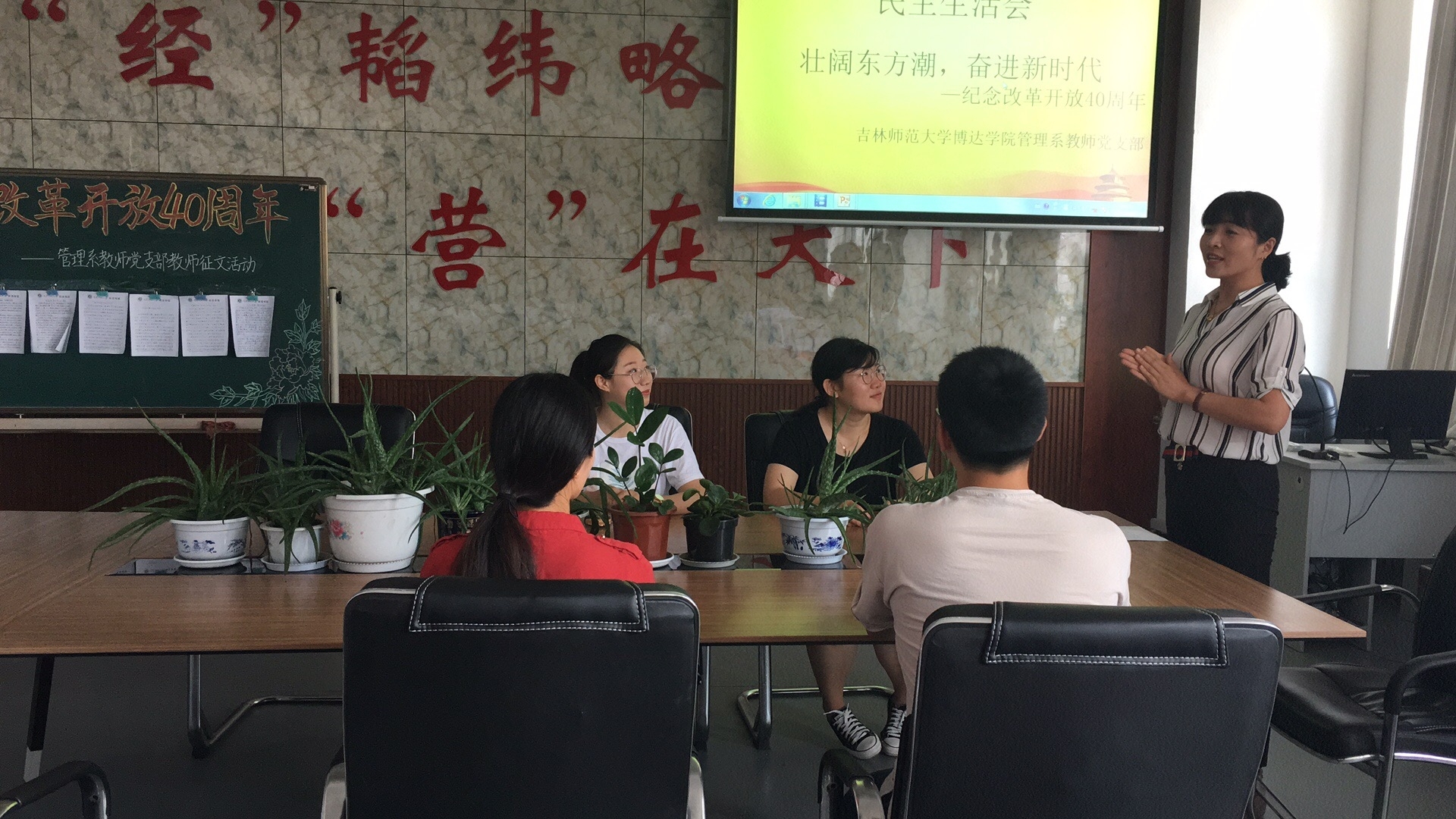 为纪念改革开放40周年,全面展示改革开放40年以来中国所取得的巨大成就,进一步增强教师党员的国家自豪感和荣誉感,6月27日,我院管理系教师党支部召开党员民主生活会,其内容:“壮阔东方潮,奋进新时代”,纪念改革开放40周年,同时在会议上展览党员教师征文并共同畅谈改革开放40年来党和国家在各方面取得的辉煌成就。本次会议由支部书记李慧主持。