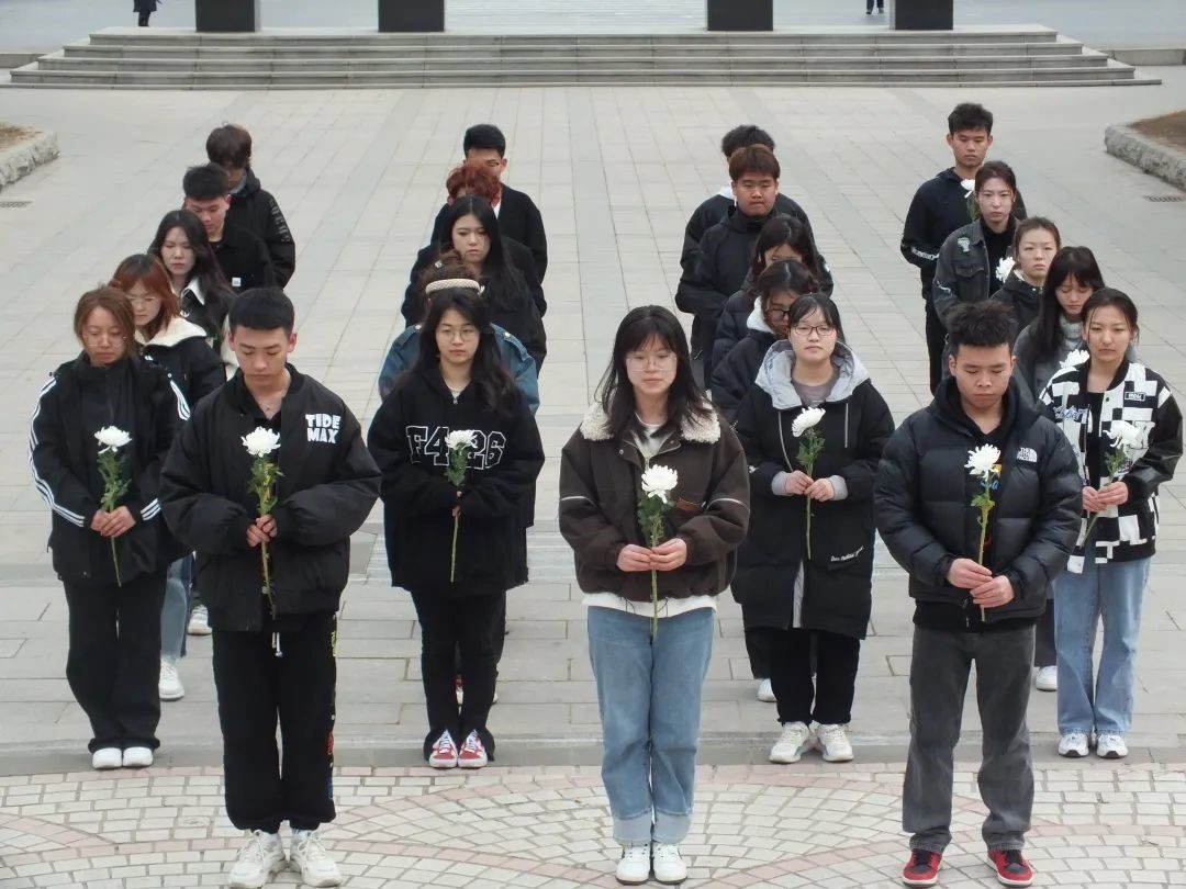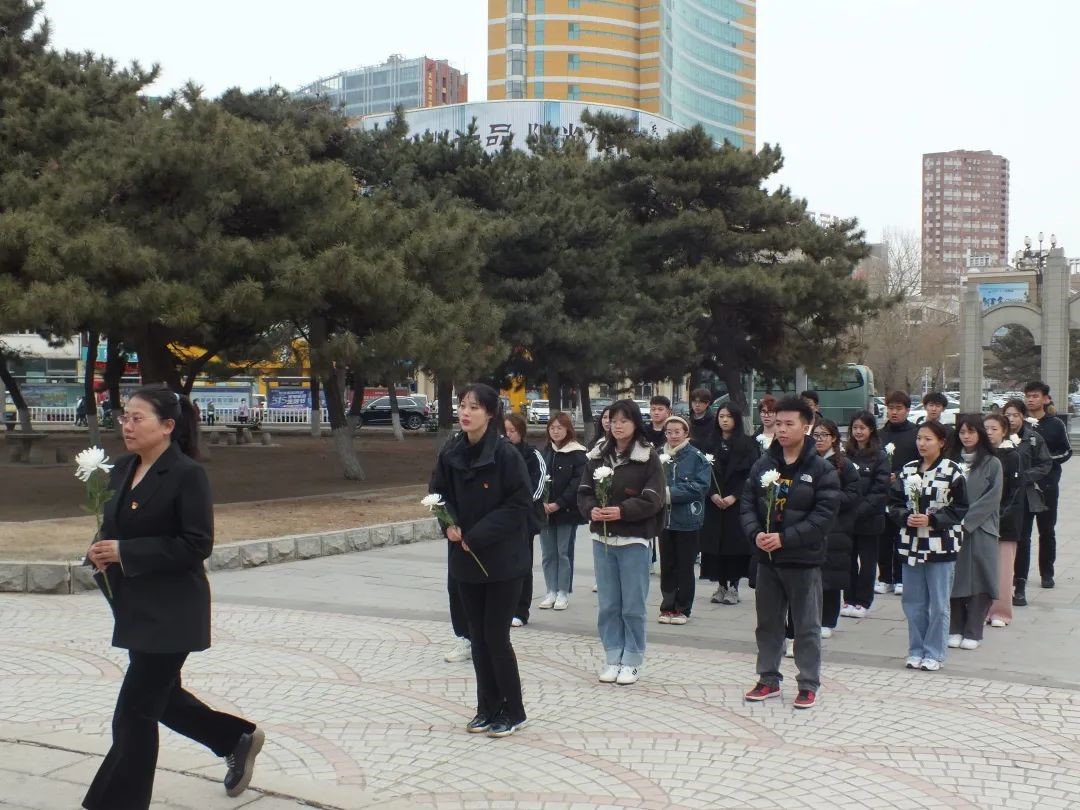 礼毕,师生们依次向烈士敬献鲜花;接下来由我院22级辅导员韩智群老师为同学们简要讲述四战四平的相关历史。