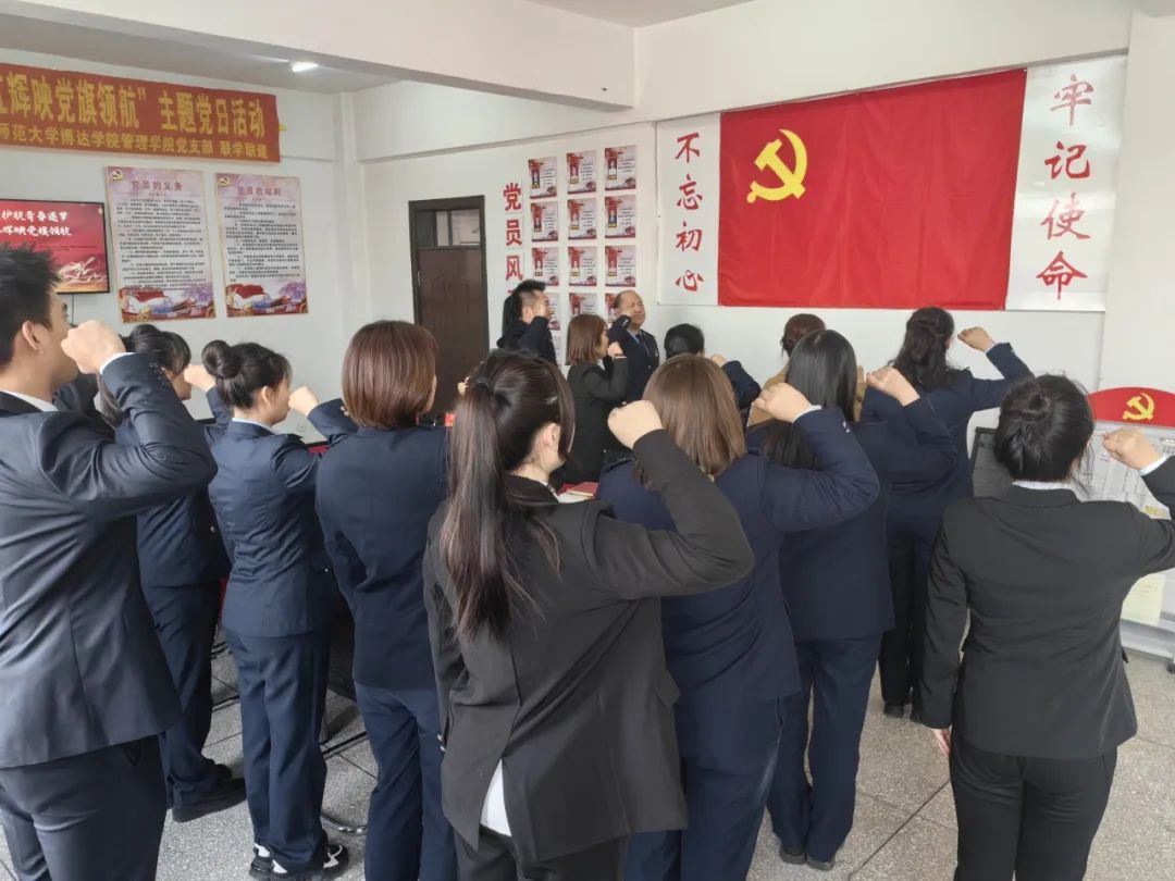 随后,四平市税务局第二税务分局党支部与管理学院学生党支部于管理学院3504党团活动室举行了“税务蓝护航青春逐梦 志愿红辉映党旗领航”主题党建活动。税蓝相接,延续奋斗;志红流传,薪火长传。党建活动由管理学院支部书记朱琳带领全体参会党员深入学习领会习近平总书记关于党的建设的重要思想。通过观看教育纪录片进行廉政警示教育,不碰红线、坚守底线,筑起拒腐防变思想防线,真正做到上不负党,正己为公。通过诵读党章,温习入党誓词来牢记自己的承诺,不忘初心,牢记使命。
