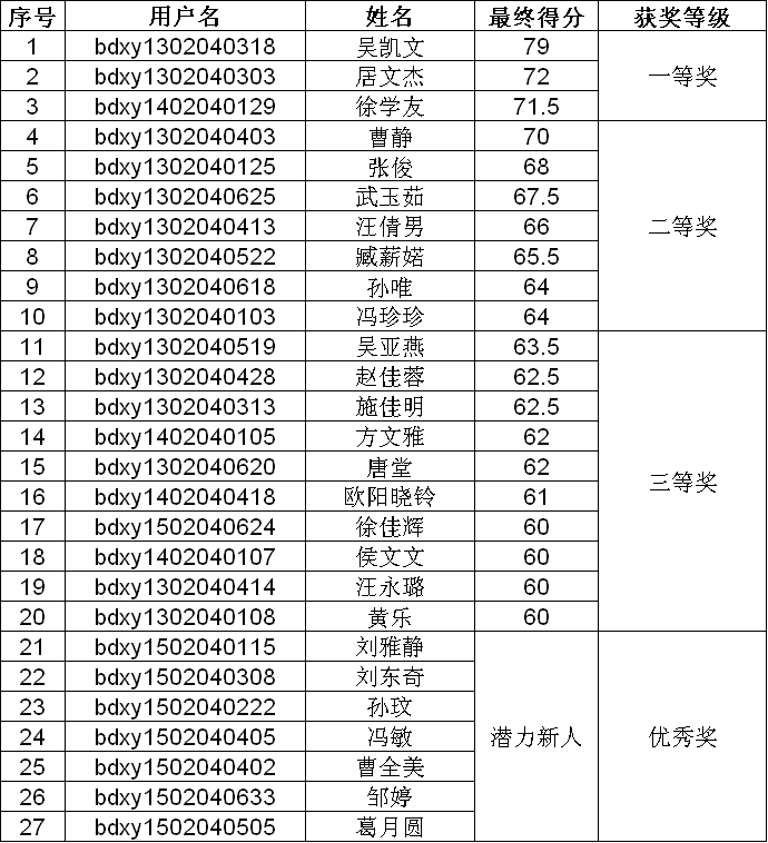 此次大赛由财务管理专业13级、14级、15级同学自愿报名,通过中华会计网校的专业共建平台在网络上进行答题,共有233人参加,是我系规模最大的一次财会专业竞赛。经过了两天8个批次的角逐,最终13级吴凯文同学夺得此次大赛的第一名,13级居文杰、14级徐学友同学分别获得第二名和第三名。获奖名单详见下表。