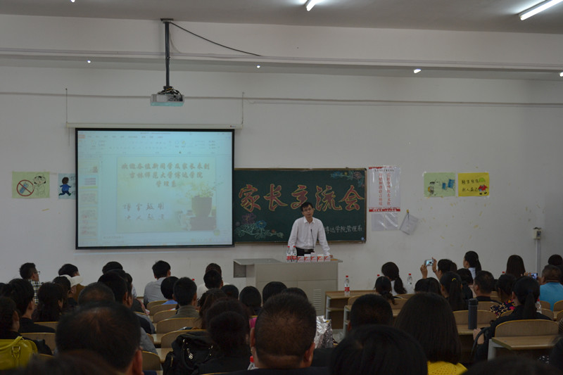 大会由王钰冲老师主持。首先,张立峰老师进行了讲话,简洁明了的介绍了地理科学专业与旅游管理专业的教学安排和师资力量;其次,赵亚芬老师也向各位家长介绍了财务管理、市场营销、人力资源、社会工作这几个专业的大致情况和就业发现趋势;最后,学工办主任耿丽娜老师进行了总结性发言,主要是介绍学生在生活方面的注意事项和学习方面的严格要求。会议结束后家长也纷纷留下具体询问关于管理系的各种情况,老师们也认真的一一进行解答。