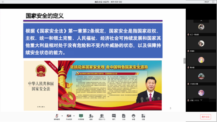 2020年4月15日是第5个全民国家安全教育日。为深入贯彻落实习近平总书记关于做好国家安全工作的一系列重要指示精神,结合目前疫情防控形势。4月14日,吉林师范大学博达学院管理学院学工办组织全体学生开展线上“全民国家安全教育”主题班会,引导学生将总体国家安全观贯穿抗疫全过程,履行应对突发公共事件的职责义务,提升维护国家安全的自觉性和主动性。