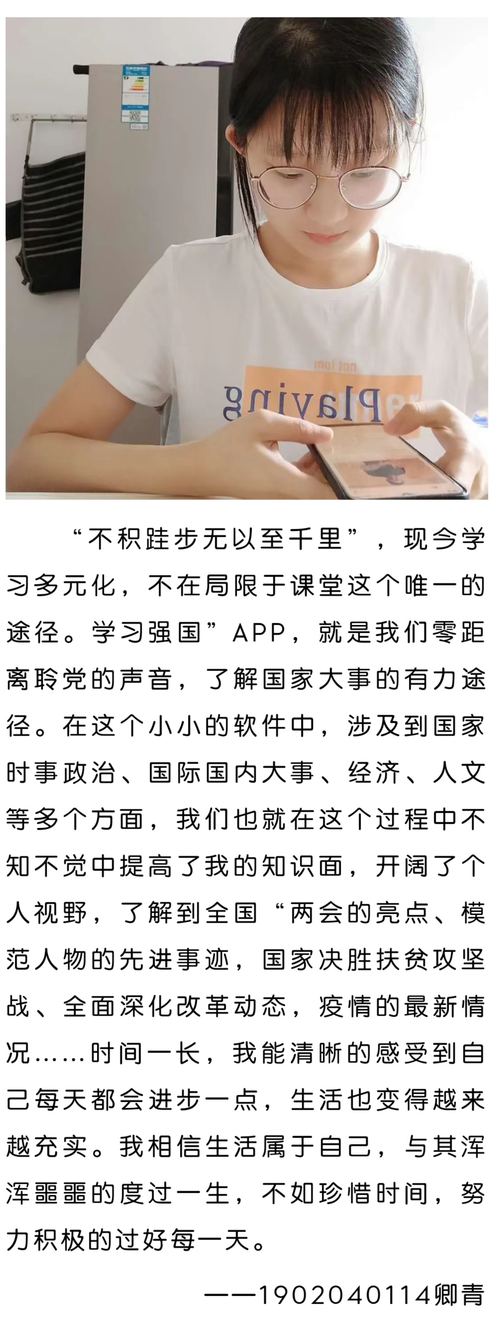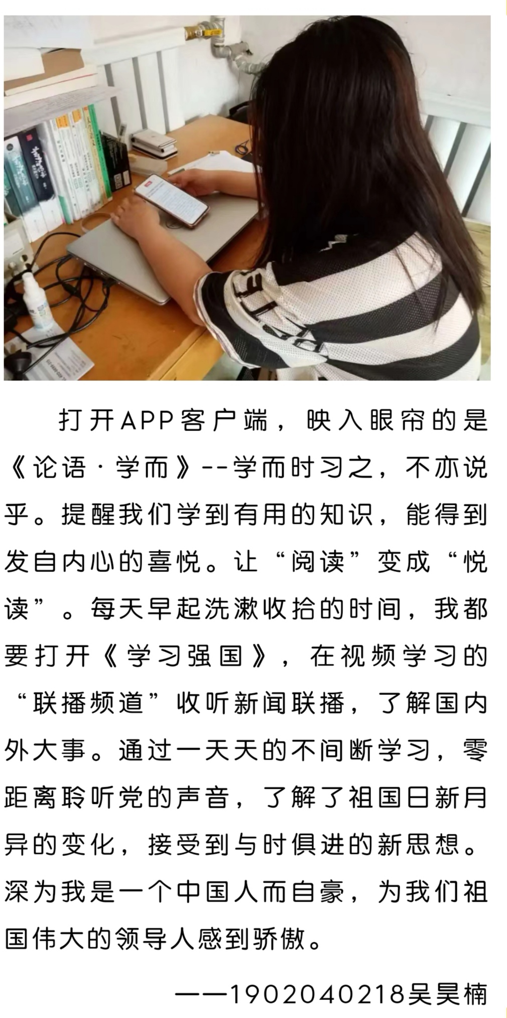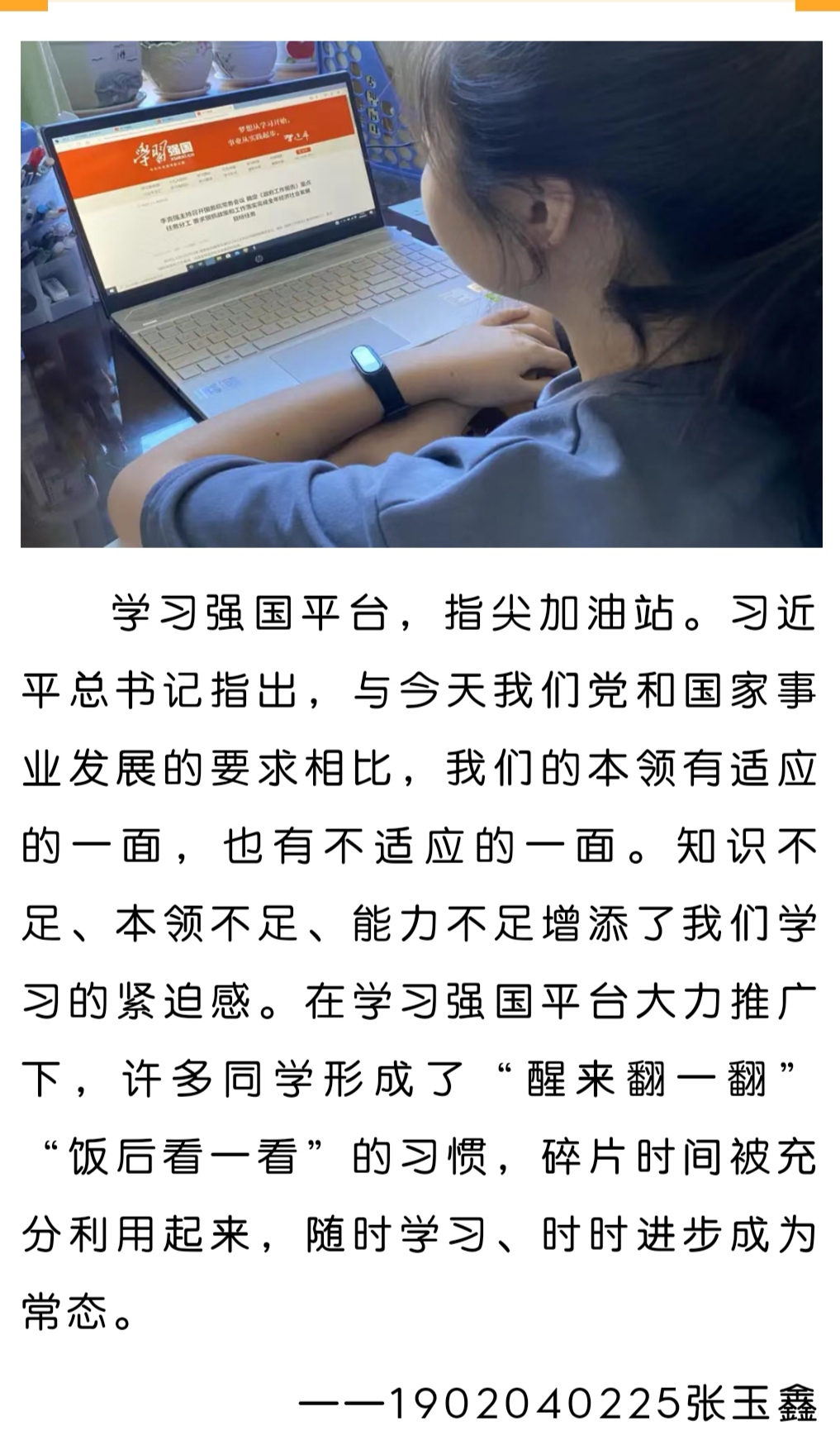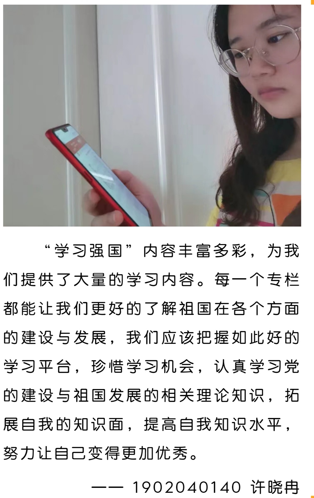 通过在学习平台上一段时间的坚持学习,我院全体学生理论学习的主动性和积极性显著提高,理论知识水平明显提升,学习氛围浓厚,学习效果较好。“学习强国”这一学习平台不仅是党员干部理论武装的“加油站”,也是当代青年学习的“新高地”。各位同学们,让我们撸起袖子加油干,时不我待、只争朝夕,让我们行动起来,切实把“学习强国”平台当作学习助手,为实现民族复兴而不懈奋斗吧!