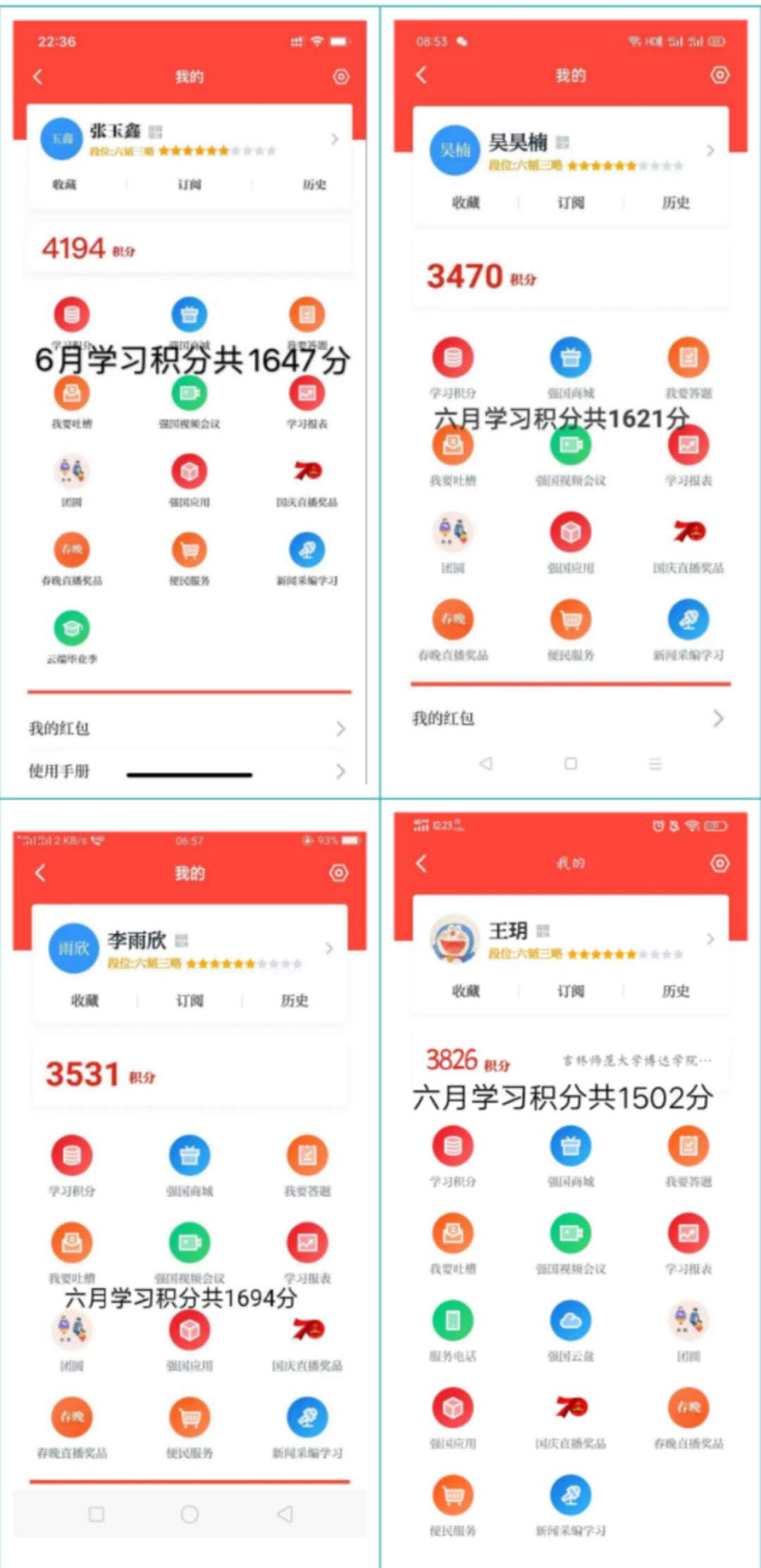 “学习强国”平台内容丰富,聚合了大量可免费阅读的期刊、古籍、公开课、歌曲、电影、图书等资料。同时还开通了各省市区分平台,展示各地特色的学习资源。其中的时政新闻、人文社科、思想解读等内容让“学习强国”成为习近平新时代中国特色社会主义思想最权威、最全面的信息平台,也构筑出了一个干事创业的理论宝库、强魄铸魂的精神家园。6月份以来,我院同学积极参加学习,每日在班级群中汇报学习情况,并且积累学习积分,以此激励广大同学比学赶超、不断学习。