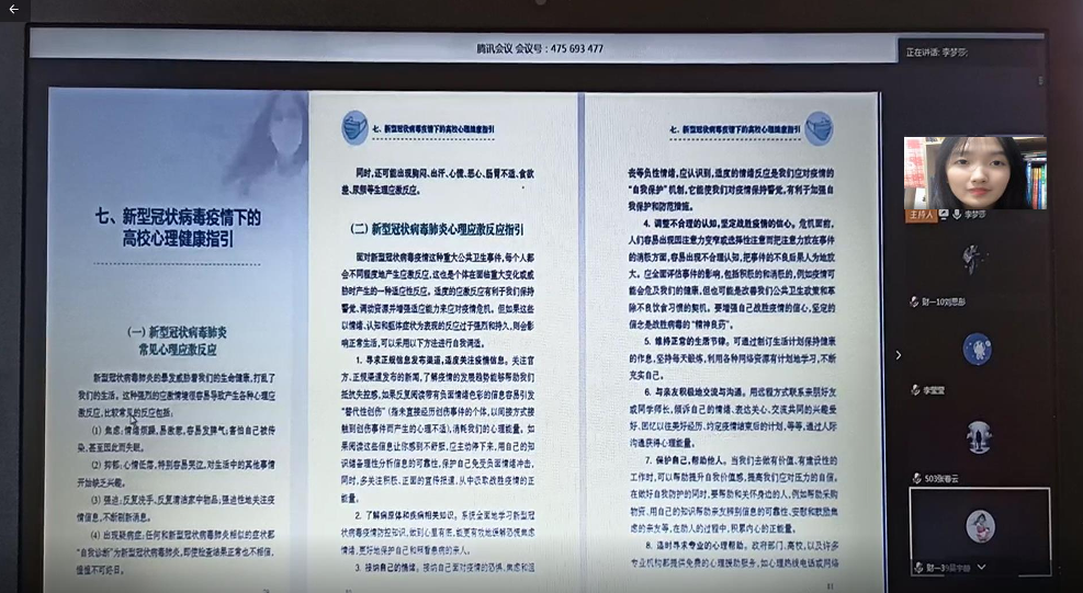 自新冠肺炎疫情发生以来,为深入贯彻落实中央部署和省委要求,进一步提高大学生的安全防范意识。2020年3月15日,吉林师范大学博达学院管理学院通过线上会议的形式组织学生学习《高等学校新型冠状病毒肺炎防控指南》,我院学生积极参与并认真学习。