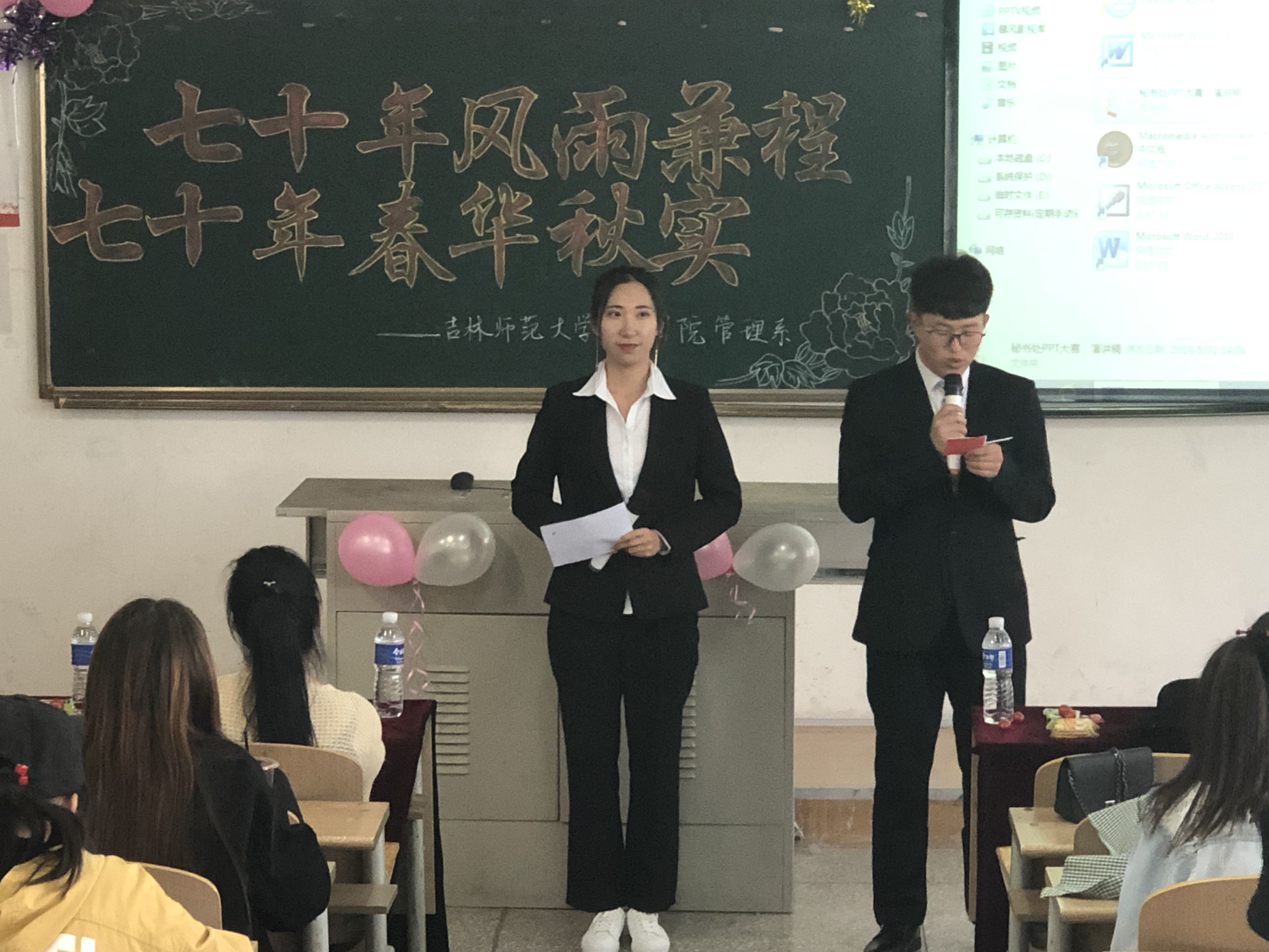 历史的车轮滚滚向前,从未停止。建国至今的七十年注定是不平凡的七十年。行是知之始,知是行之成,为了让同学们了解祖国七十年的成长历程,吉林师范大学博达学院管理系秘书处于2019年5月31日下午,在3520阶梯教室举办了以“七十年风雨兼程,七十年春华秋实”为主题的PPT演讲比赛。出席本次活动的嘉宾有管理系辅导员耿丽娜老师、梁婧老师、蒋迪老师和17级、18级各班同学。