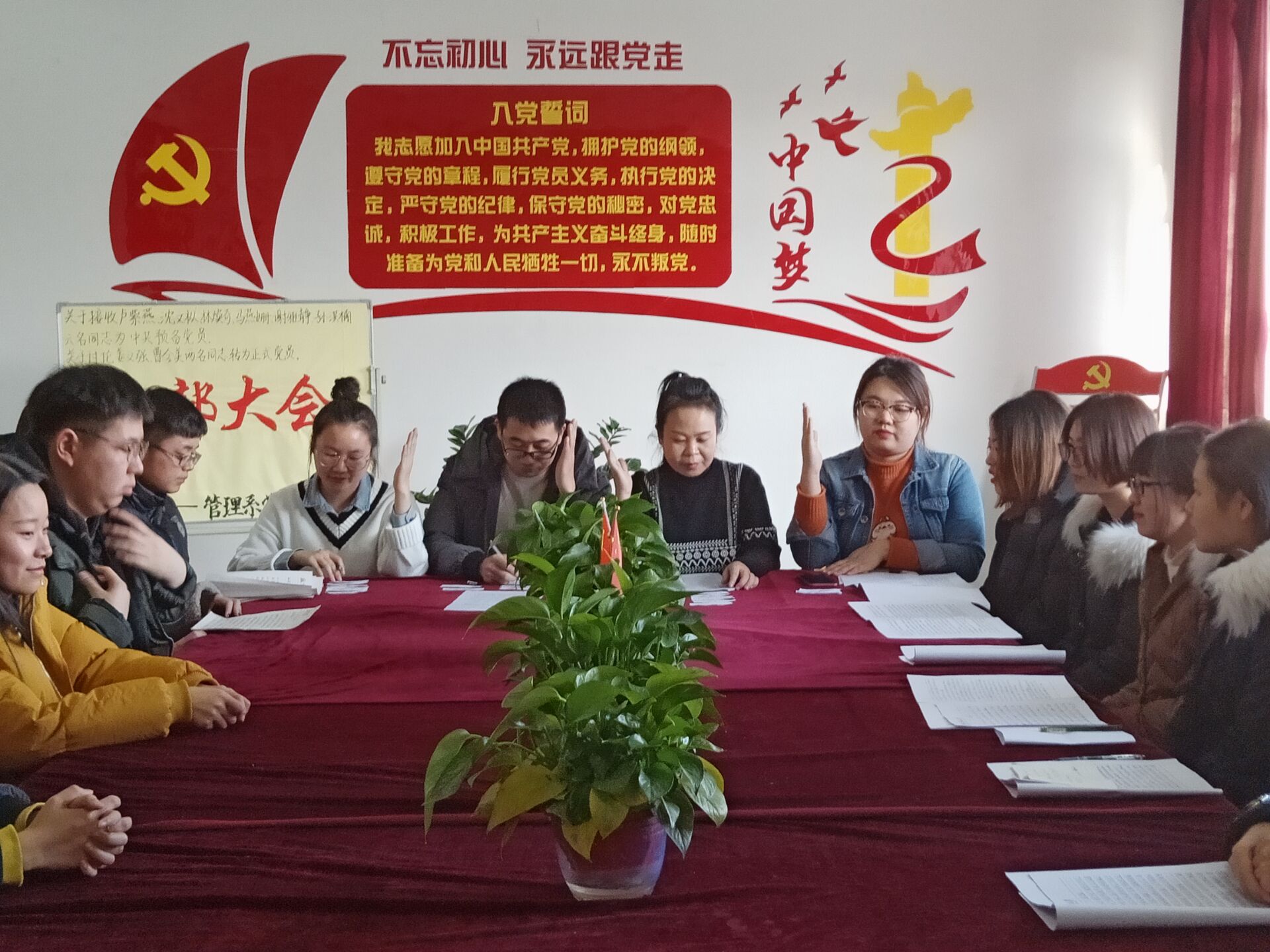 本次支部大会讨论发展六名中共预备党员、讨论两名预备党员转正。在他们铿锵有力的演讲之后,让人看到了他们转正的决心和信心,他们明确了党的权利和义务,在思想上和党组织保持高度一致。党支部书记耿丽娜强调他们要发挥党员的先锋模范作用,牢记使命,激发奋发进取、顽强拼搏、接续前进的不竭动力。进入新时代党的建设涉及到很多新课题、新任务,提高善抓落实、狠抓推进的能力,学习新知识、掌握新方法,善于用新的理念来指导实践,用新的思路来破解难题,撸起袖子加油干。作为一名党员就要勇于担当、敢负责、善作为,做特色社会主义思想的模范践行者、新使命的奋力担当者、新征程的自觉开拓者。只有敢于迎接挑战、战胜挑战才能把握和创造机遇,才能把握和创造未来。我们应该确立远大志向,珍惜年华,刻苦学习,磨炼意志,砥砺品格,为祖国的繁荣富强贡献力量