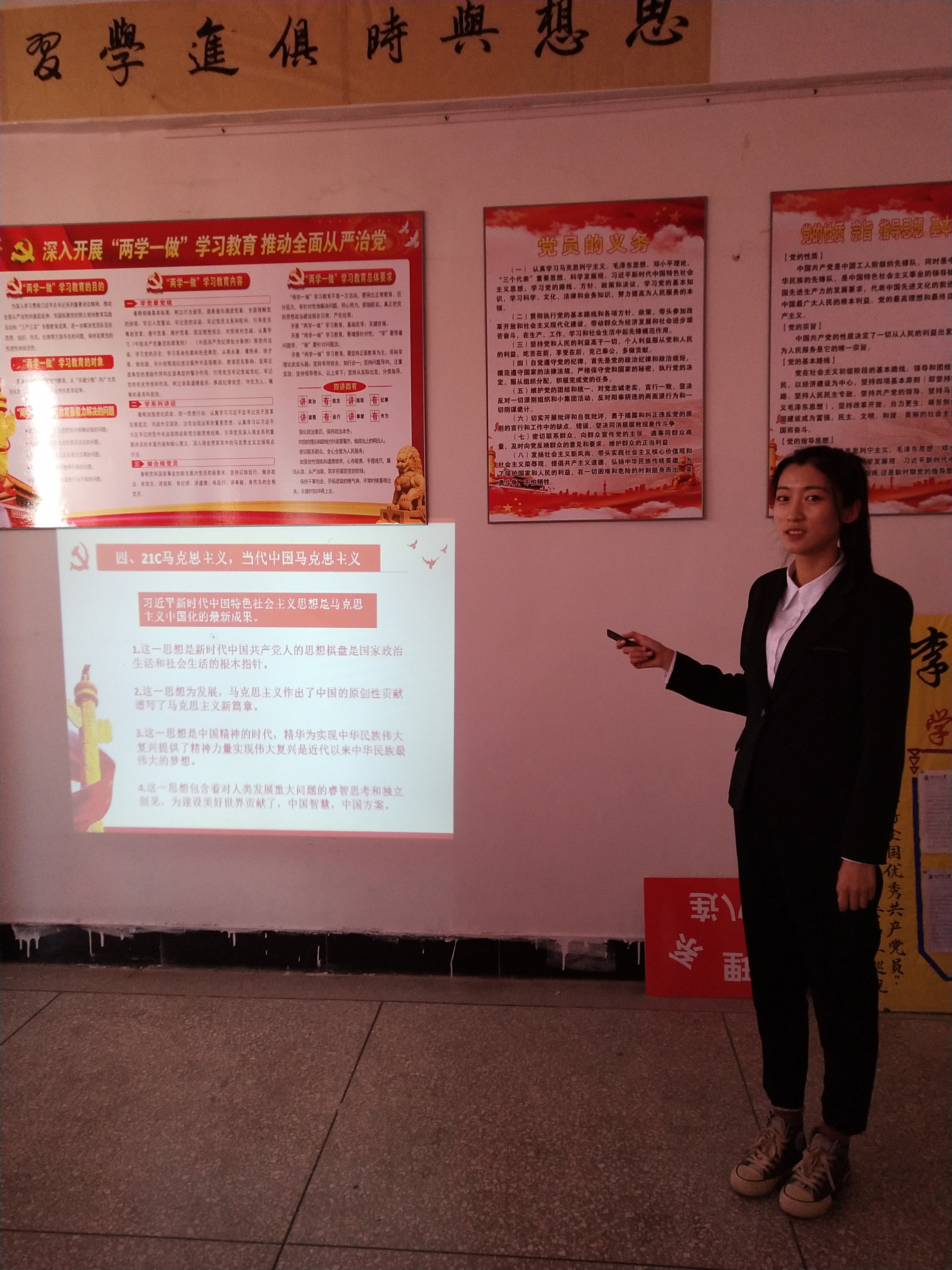 会议上,谭孝雪同学通过PPT展示和自己的讲解,为我们阐释学习第一讲“习近平新时代中国特色社会主义思想是党和国家必须长期坚持的指导思想”,讲述了习近平新时代中国特色社会主义思想的产生的重大意义和科学体系,习近平新时代中国特色社会主义思想,是党和人民实践经验和集体智慧的结晶,习近平总书记是这一思想的主要创立者。这一思想内涵十分丰富,包括新时代坚持和发展中国特色社会主义的总目标、总任务、总体布局、战略布局和发展方向、发展方式、发展动力、战略步骤、外部条件、政治保证等方面的基本问题,对中国社会的方方面面和党的建设等各个方面作出理论分析和政策指导,习近平新时代中国特色社会主义思想正是在这样的伟大时代中应运而生、在当代中国的实践新发展中顺势而成的。全体预备党员专心听谭孝雪同学宣讲,并认真做好笔记。会上,各位同学依次对本次宣讲发现自己的感悟。
