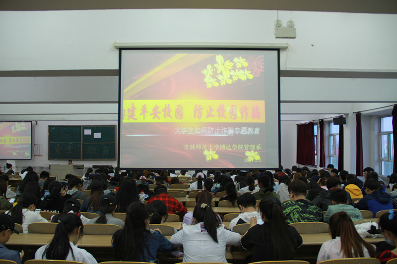 2017年5月3日18:30分,吉林师范大学博达学院管理系16级全体学生在我校3601教室召开了“防盗防骗安全会议”。此次会议目的是为了使学生了解一些防盗防骗的安全常识,学习一些遇到坏人骗子的紧急应对方法,培养学生一定应变能力,保护自身的安全。