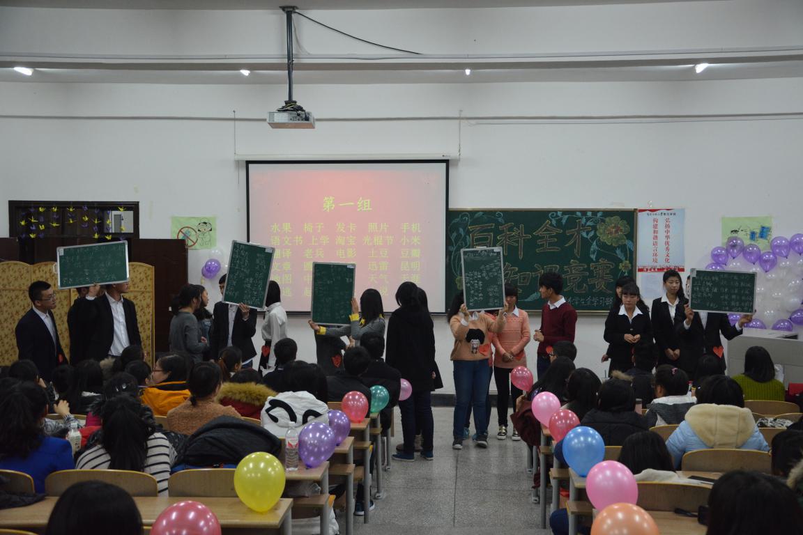 为促进学生学习,增加知识储备量,2014年11月14日晚上6:30分,吉林师范大学博达学院管理系学习部在3521教室举行了“百科全才知识竞赛”活动,共有五组选手参加比赛。