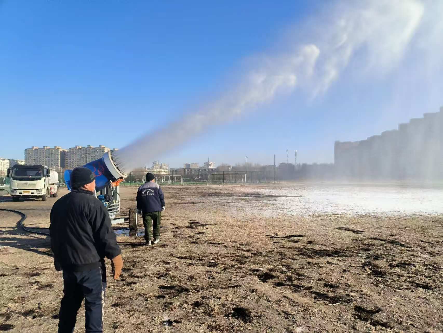为确保冰雪场地尽早投入使用,后勤管理处提前谋划、科学统筹。在冰场建设现场,工作人员严格按照施工规范,历经场地平整、防水处理、注水冻冰等多道工序,加班加点推进建设进度。从冰层厚度把控到场地边界规划,每一个细节都力求精益求精。学校购置专业造雪机后,后勤管理处组建专项工作小组负责雪场搭建。工作人员根据天气条件精准调控造雪参数,在校园开阔区域有序开展造雪作业,银装素裹的雪场必将如期与师生见面。