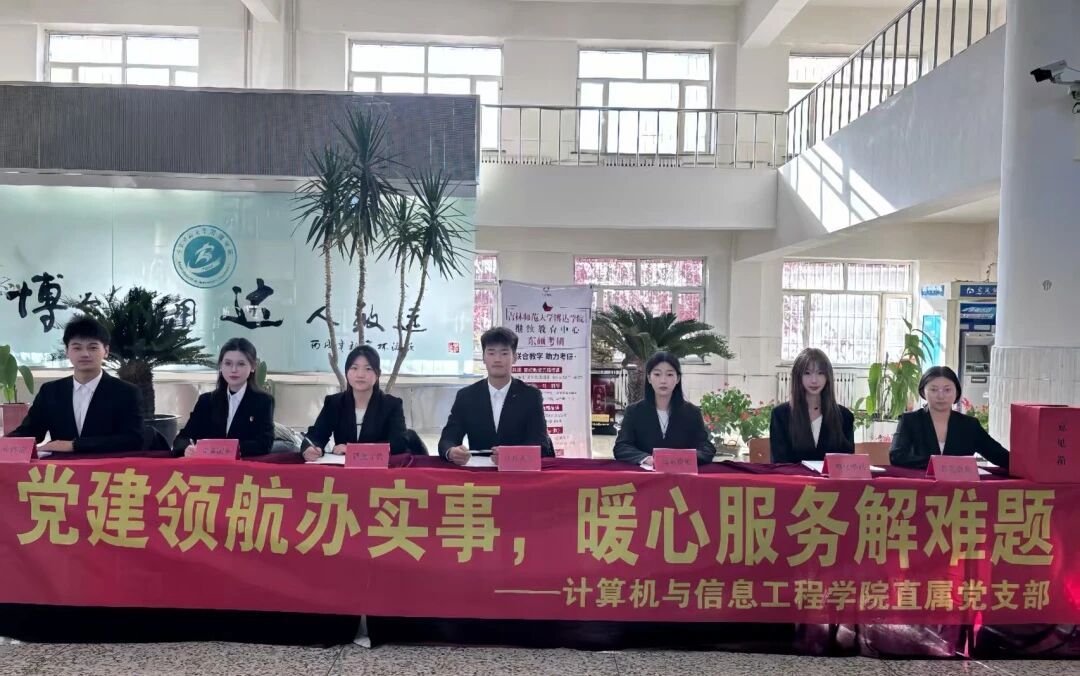 为深入推进“我为群众办实事”实践活动,切实解决学生在学业发展、党务团务、政策咨询等方面的实际问题,2025年9月28日中午,计算机与信息工程学院在老校区一楼大厅成功举办“党建领航办实事,暖心服务解难题”主题活动。本次活动由学院中共党员和入党积极分子现场设点,为同学们提供面对面的咨询服务和政策解答。 活动现场设置了学业咨询、党务团务、评奖评优、征兵入伍、国家资助、量化细则和意见收集等多个专项服务点,由梁佳旺、...