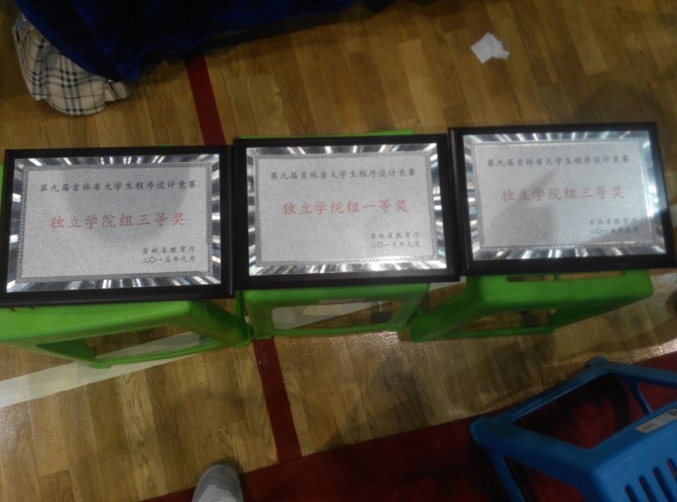 2015年9月4日,在吉林大学前卫校区体育馆,由曹宇老师带队及全体参赛队员在经历热身赛及正赛,近八个小时的紧张角逐。最终我院3个代表队“泥奏凯”、“唐势风”和“埃尼阿克”在由吉林省教育厅主办,吉林大学、吉林省计算机学会承办的“第九届吉林省大学生程序设计竞赛”中分别荣获省级一等奖1项、三等奖2项的优异成绩。