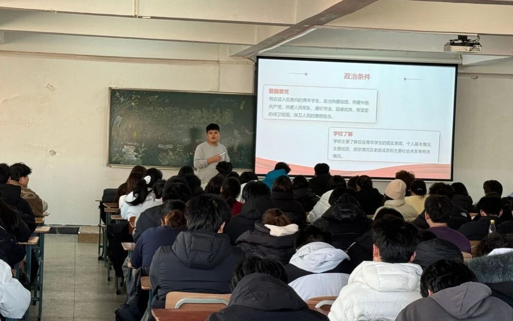 宣讲过程中,郑越洋老师围绕大学生征兵工作核心要点展开系统讲解,内容详实、条理清晰。郑老师首先对入伍基本条件、征兵报名流程、体格检查标准、政治考核要求等基础事项进行逐项解读,结合2026年征兵工作最新要求,明确不同学历层次学生报名的具体条件与时间节点,帮助同学们精准掌握征兵工作的基础规范,厘清参军入伍的前置流程。