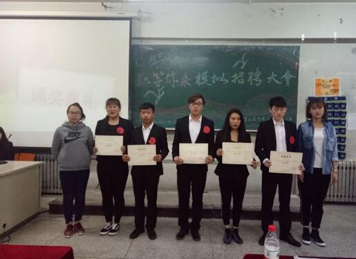 模拟招聘大赛主要面试的职位分为:人事专员,软件工程师,游戏测试工程师,程序员和销售总监五个职位,分别由五名学长学姐来面试。面试分为三环节:自我介绍,即兴演讲,职场问答。杨镇源学长在面试中谈吐大方,语惊四座;张洪斌学长在职场问答中语言幽默,使得评委老师忍俊不禁;贾笃圆学长沉着冷静,应对自如;于越学姐妙语连篇,但在即兴演讲中还有点小紧张;刘思佳学姐也发挥的十分出色。最后评委老师在现场进行打分并为学长学姐颁发证书。活动最后还以小剧场的方式为我们展示了职场面试礼仪知识。