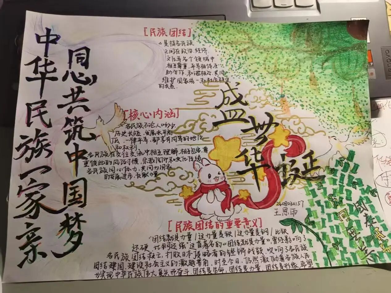 为深入学习贯彻党的民族政策,弘扬民族团结主旋律,增进各民族学生间的了解与情谊,营造“各民族像石榴籽一样紧紧抱在一起”的和谐校园氛围,计算机与信息工程学院举办了“中华民族一家亲 同心共筑中国梦”手抄报评比大赛。