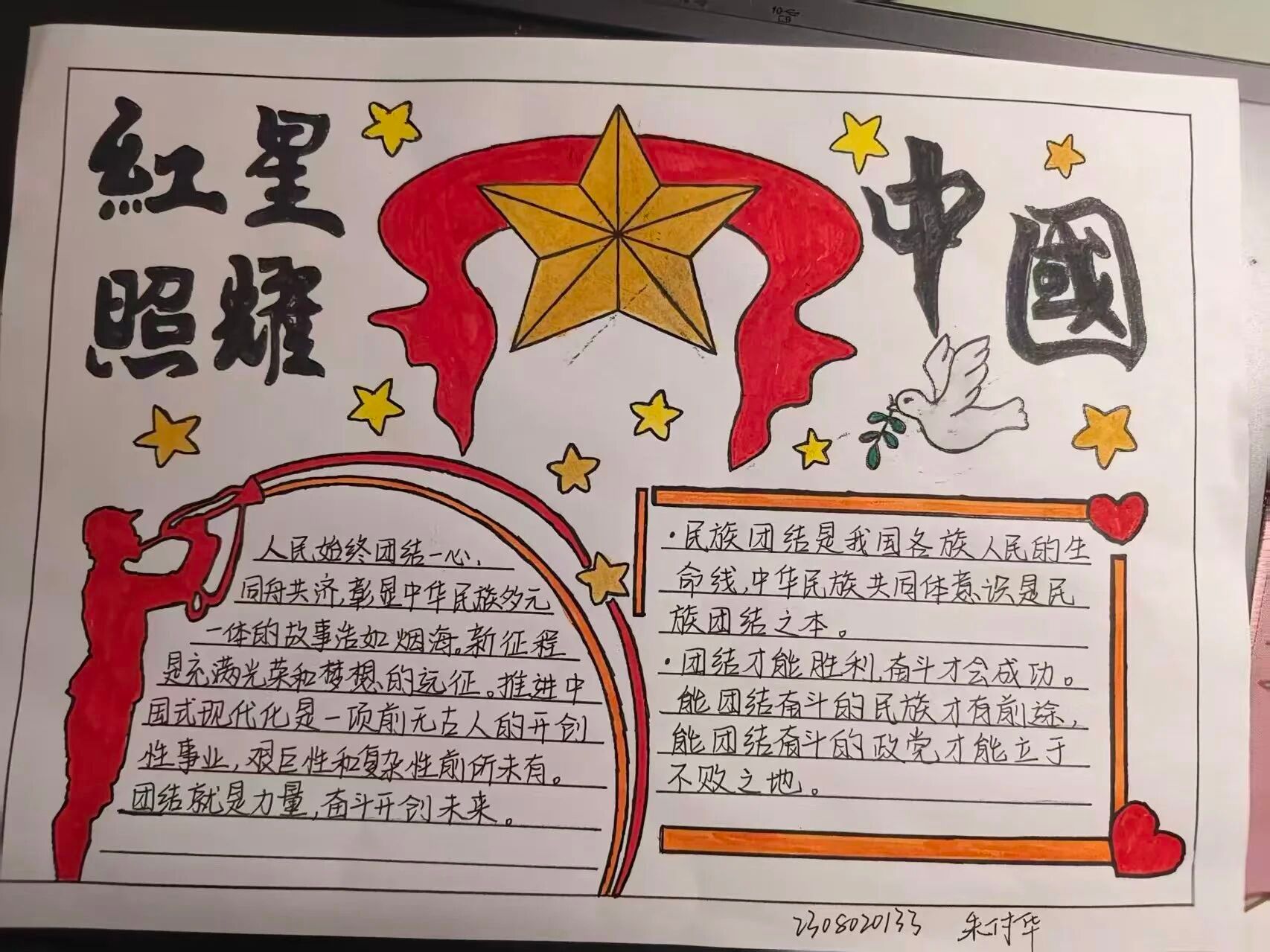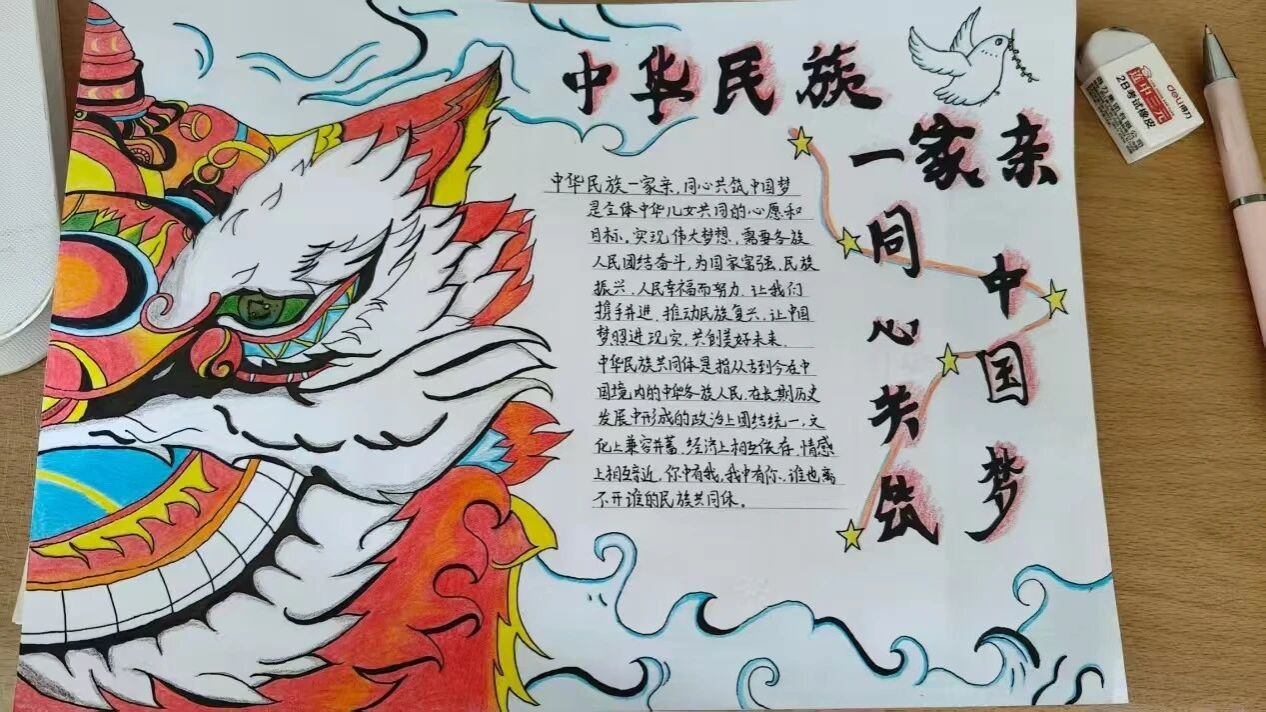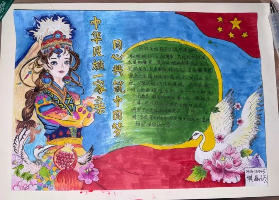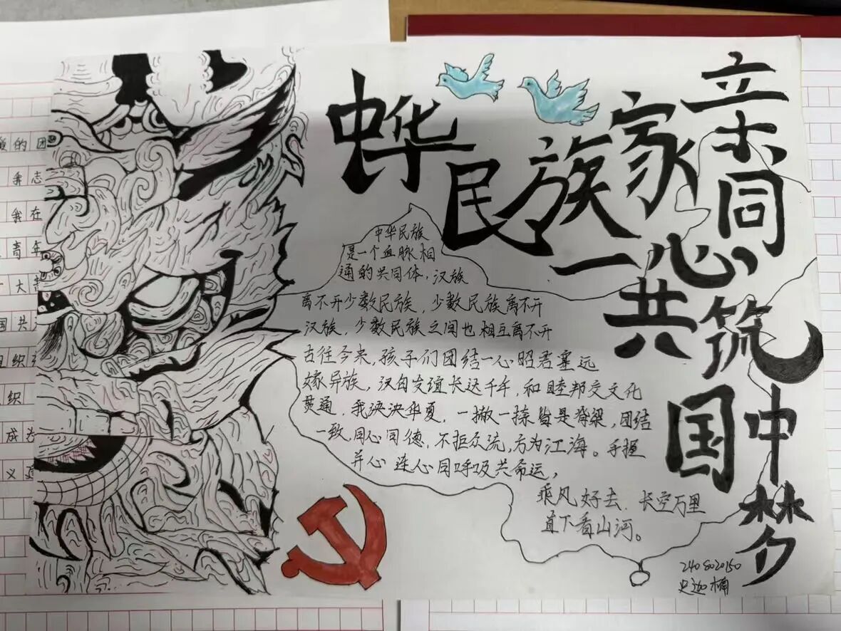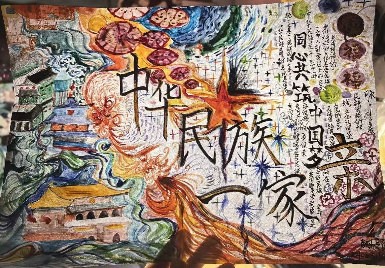 活动现场气氛热烈,同学们踊跃参与。他们或凝神构思,或挥笔勾画,巧妙地将民族团结元素融入创作。最终呈现的作品版面精美、主题突出,成为了凝聚民族情感、抒发爱国情怀的生动载体。