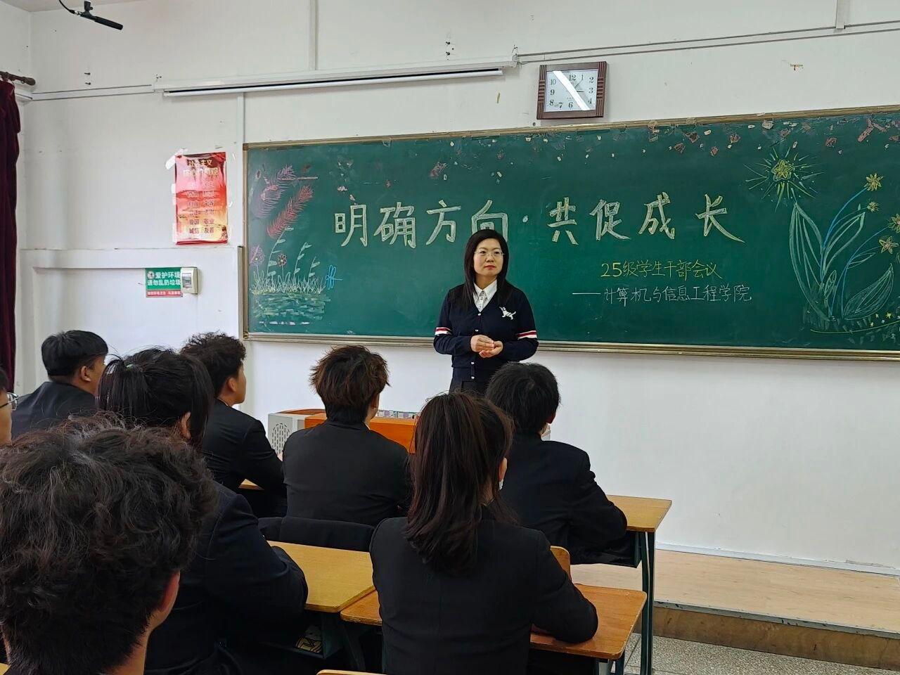 为筑牢班级建设根基,明确新生班委职责使命,凝聚服务同学的合力,11月12日15:00,计算机与信息工程学院在3201教室召开2025级新生班委工作部署会。会议由学院辅导员常秀云老师主持,2025级全体新任班委参加。