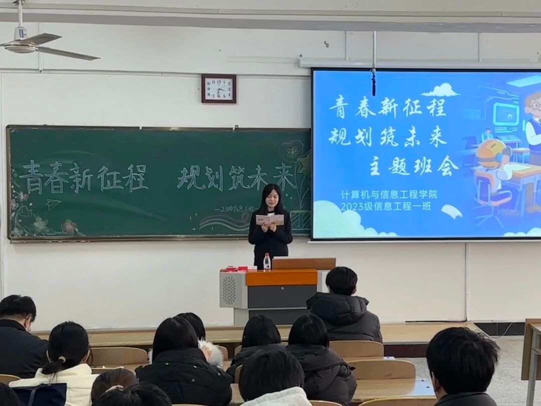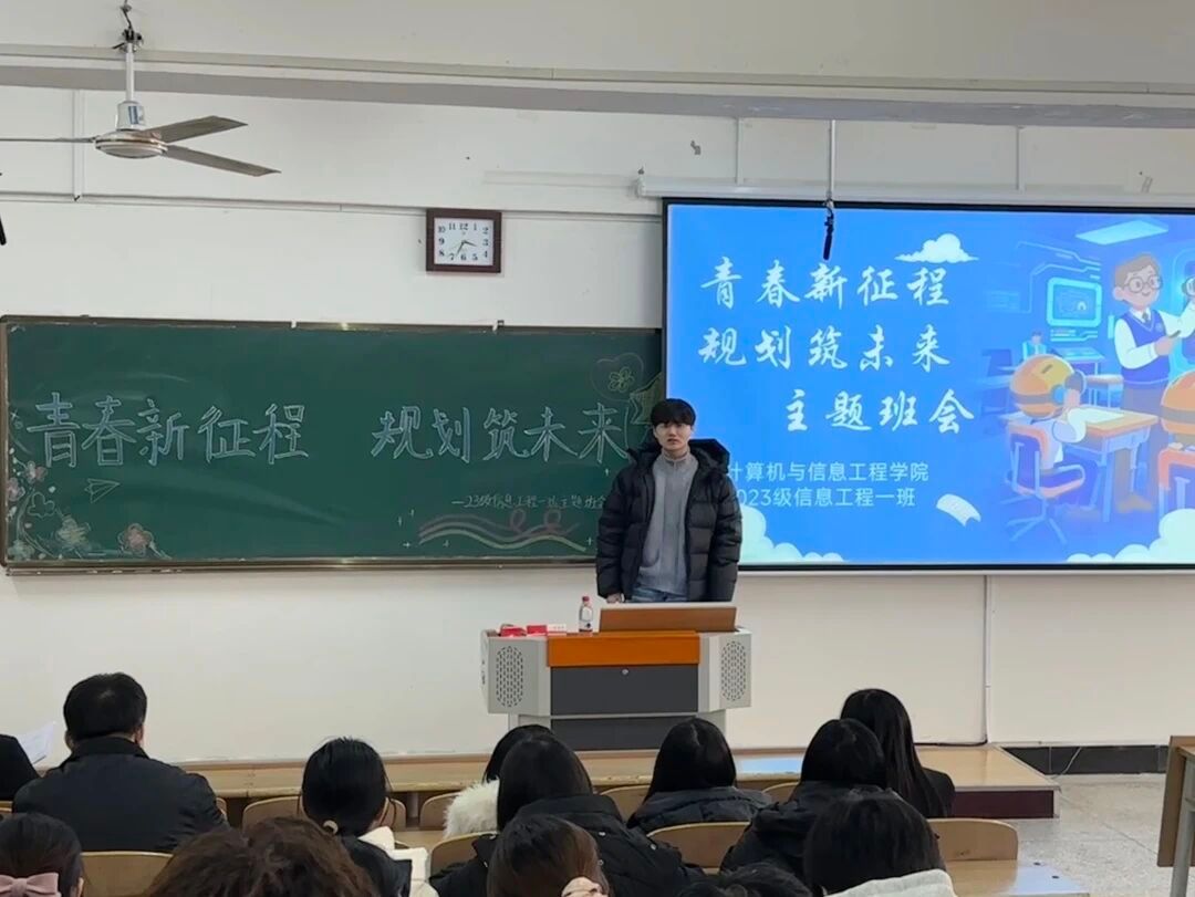 为帮助同学们明晰毕业去向、科学规划职业发展,3月10日,计算机与信息工程学院2023级信息工程一班召开“青春新征程,规划筑未来”主题班会。班会由班级班长主持,辅导员郑越洋老师和潘宇航老师及全体同学参会。