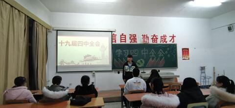 为全面学习贯彻四中全会精神,我院在2019年11月20日晚六点三十分于1529组织全体大一学生开展四中全会理论宣讲活动,本次活动由李晶主持。李晶、高诗琪、刘婷婷、李胜祥发表讲话。