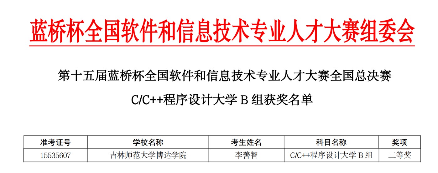 近日,在第十五届蓝桥杯全国软件和信息技术专业人才大赛中,计算机与信息科学学院学子共获省奖8项,其中省赛一等奖获得者李善智同学晋级蓝桥杯全国总决赛,并荣获国家级二等奖。