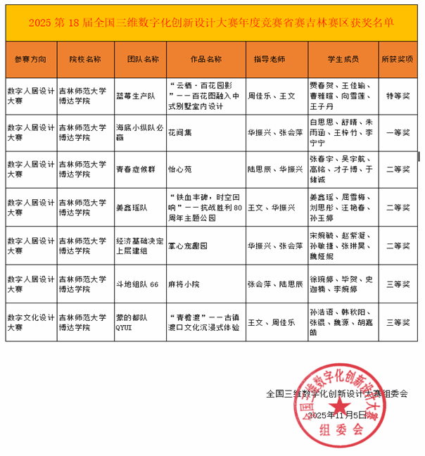 近日,第18届全国三维数字化创新设计大赛吉林省赛圆满落幕。在这项国家级高水平创新赛事中,吉林师范大学博达学院计算机与信息工程学院共派出7支队伍参赛,最终斩获省级特等奖1项、一等奖1项、二等奖3项、三等奖2项。其中,荣获特等奖的队伍将晋级全国总决赛。全国三维数字化创新设计大赛是教育部认可的全国普通高校学科竞赛榜单赛事,涵盖数字工业、数字人居等9大赛项。本届大赛以“数智融合,创见未来”为主题,吸引全省高校学子同台竞技。...