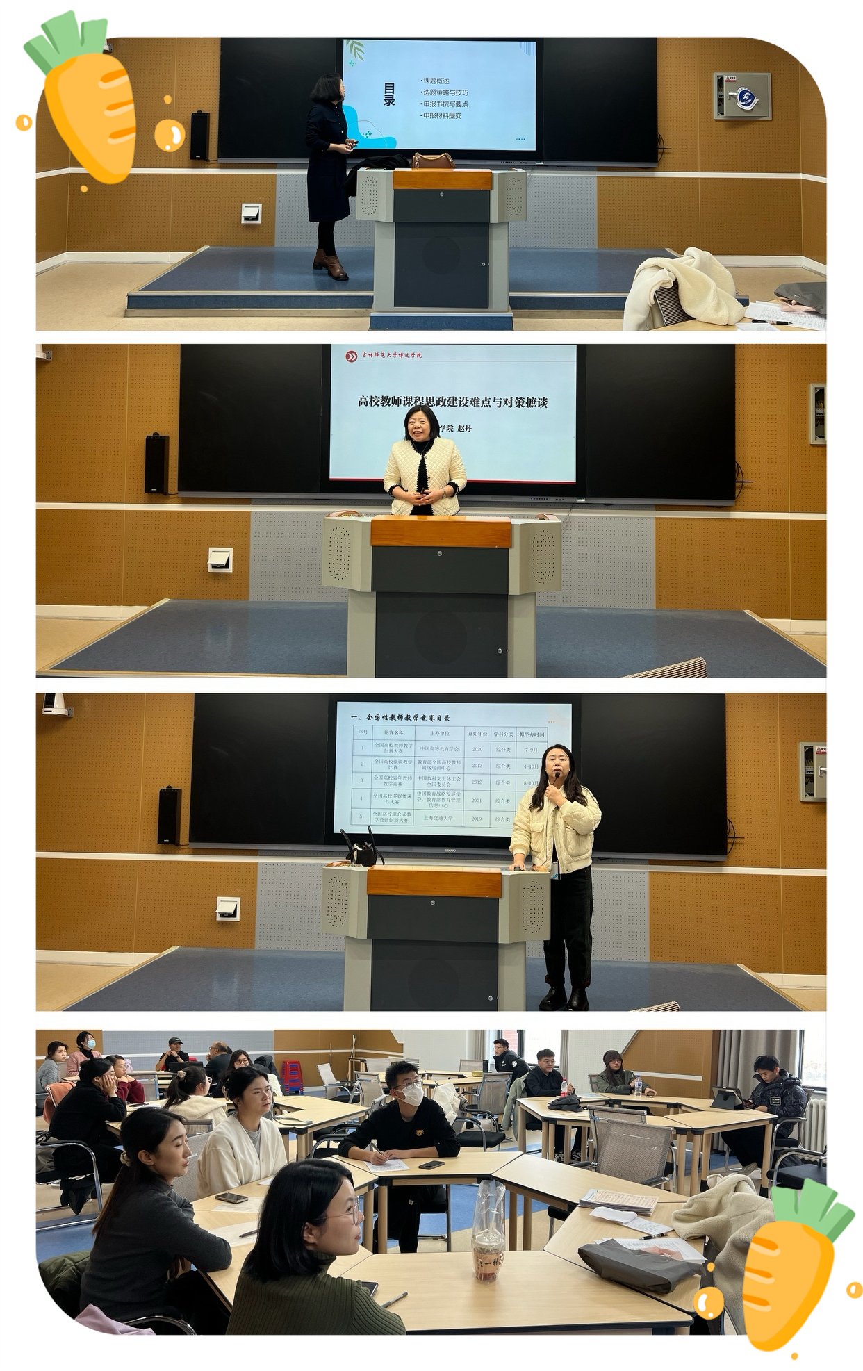 接着,赵老师为新入职教师解读《高等学校课程思政建设指导纲要》,认为教师应深入挖掘各门课程所蕴含的思想政治教育元素和所承载的相应功能,实现思想政治课与其他课程“育人”同向同行和协同效应。随后介绍课程思政特征、意义,同时列举专业课实施课程思政难点与对策,建议教师应挖掘专业课育人元素,将课程思政融入教学全过程。