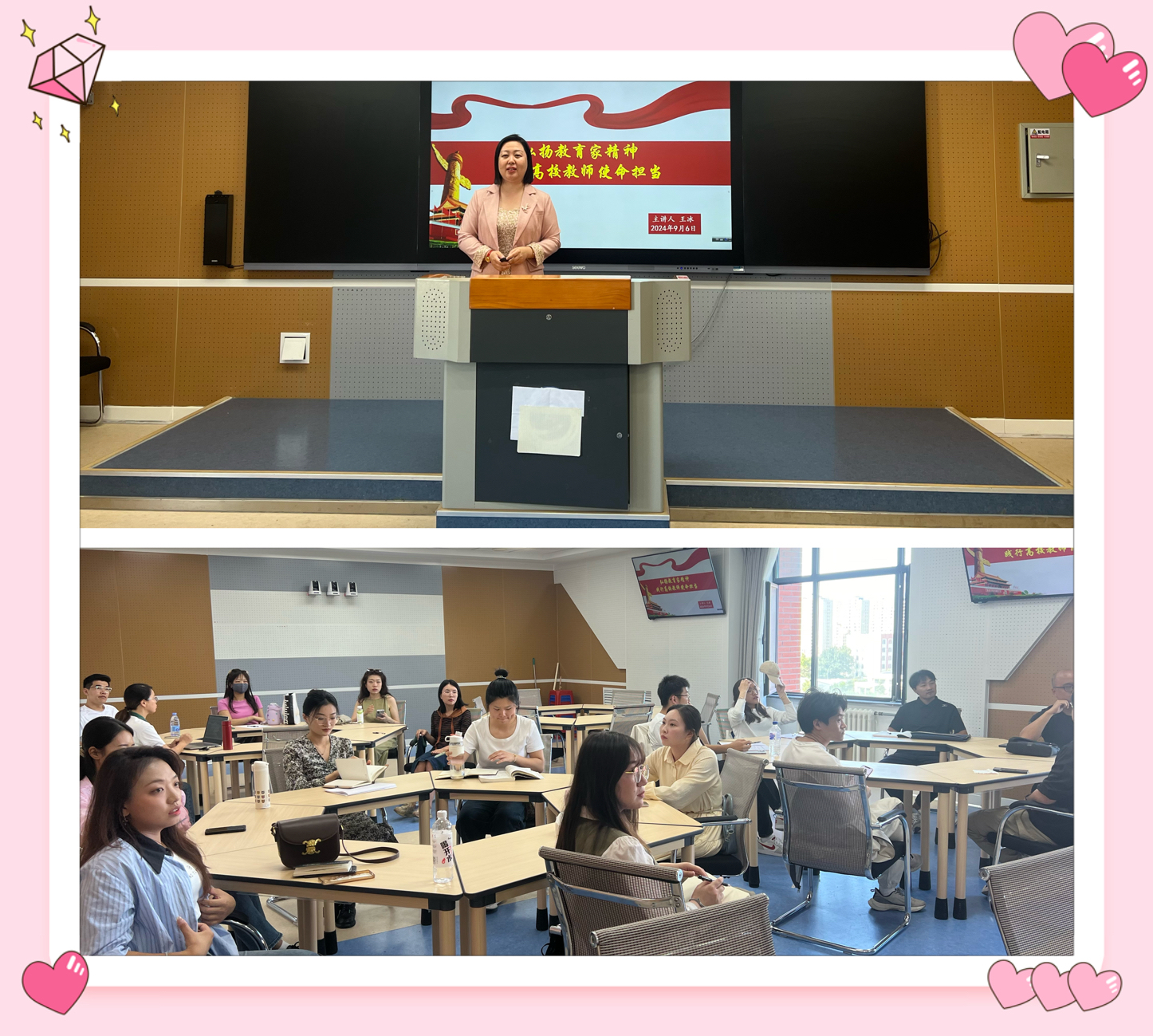 首先,王院长提炼出党的二十大报告和党的二十届三中全会关于教育、教师的相关表述,认为教师对国家繁荣、社会发展起着重要作用,同时教育是全面建设社会主义现代化国家的基础性、战略性支撑之一,因此应大力弘扬教育家精神,努力成为高素质、专业性强的优秀教师。随后,介绍了“人民教育家”于漪、高等教育学学科开拓者与奠基人潘懋元、北大校长蔡元培等人的故事,我们作为新时代高校教师更要坚定政治方向,潜心教书育人,关心爱护学生,积极奉献社会,坚守廉洁自律。最后,王院长表明我们教在博达,要努力做有情怀、有水平、有温度的好老师,践行教育家精神,共同谱写教育教学高质量发展新篇章。