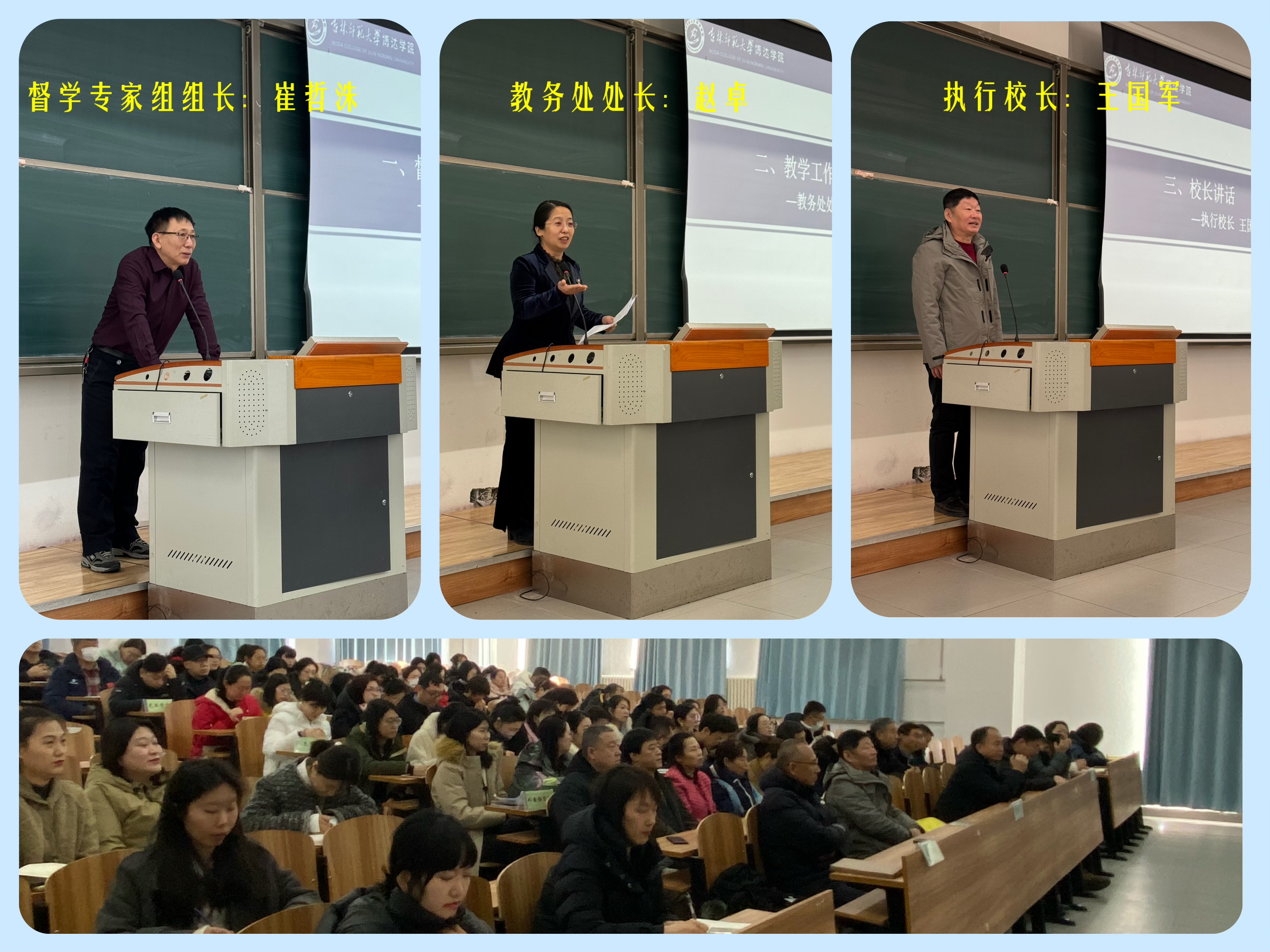 督学组长崔哲洙教授就上学期工作进行了全面总结,对教学秩序、教学质量以及教学态度等方面展开了细致的点评,并强调了本学期工作重点。他指出,在过去的一学期中,我院在教学上取得了显著成绩,但也存在一些问题需要改进。崔教授鼓励教师夯实教学基本功,加强教师专业素养与教学能力,全力打造高质量课堂。