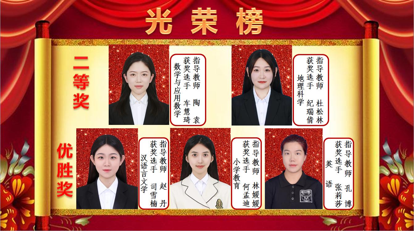 我校教务处赵卓处长亲自带队赶赴浙江师范大学参加决赛,参赛选手在决赛环节中,分别经过教学设计、多媒体课件制作、即席讲演、模拟上课、板书等大赛环节,赛场上我校学子沉着应战、稳定发挥、勇夺佳绩。最后,我校五位参赛选手全部获奖,其中地理科学专业纪瑞倩、数学与应用数学专业车慧琦获二等奖,汉语言文学专业司雪楠、小学教育专业何孟迪、英语专业张莉莎获优胜奖。