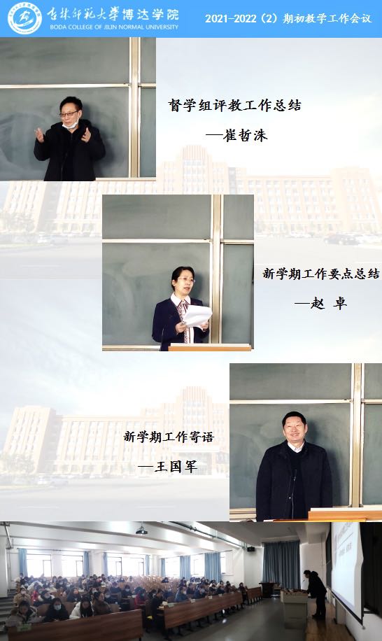 王国军校长讲话中指出,新学期要做好常规工作,加强教师管理,保证开学第一周第一天第一节课顺利开课。高度重视防疫工作,做到准备充分、责任明确,坚决避免疫情进入校园。要做好网络安全宣传,教室、实验室等网络设备应明确第一责任人。转设工作准备工作应事无巨细,教学材料、师资力量、教学过程材料等要齐备完整。实习基地建设应提高指标,保证基地质量与实习成效。本次会议明确了新学期教学工作的重点和方向,为我校提升教育教学质量、教师发展提供了明确思路与执行方案。