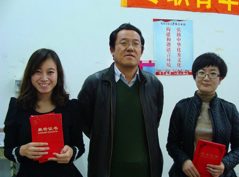 陆国志老师为二等奖获得教师隋娜娜(左)、马琳(右)颁奖