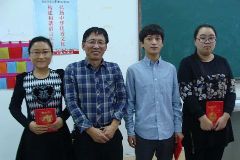 崔哲洙老师为三等奖获得教师陈宇(左一)、张行(右二)、刘莹(右一)颁奖