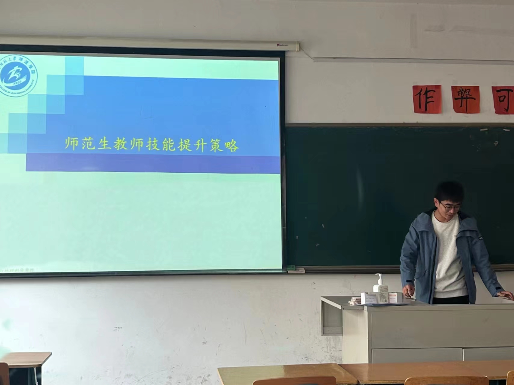 会议开始,王祥贺老师对各位老师的到来表示感谢,并说明了本次会议的主题。随后,王祥贺老师将此次教研活动分成三个部分依次讲解。第一部分为教师技能,是指教师在教学活动中运用专业与教学知识、经验达成教学目标与任务的活动方式,它将直接影响到教师的教学质量和教学成效;第二部分为基本内容,钢笔字、毛笔字、粉笔字、普通话、板画、现代化教学手段。现代化教学手段在平时的教学中可以设置一定的课时,专门训练师范生使用现代化教学媒体的能力,培养师范生利用丰富的网络资源信息,设计教学案例的能力;第三部分为教育实习,这是师范生教学能力培养的主要方法,地方高校应该切实抓好这项工作。教育实习模式应该从传统的“集中突袭式”调整为”细水长流式”。刘莹老师对王祥贺老师的讲解表示赞同,李蒙老师根据王祥贺老师的讲解,也提出了加强学生粉笔字训练的具体方法。